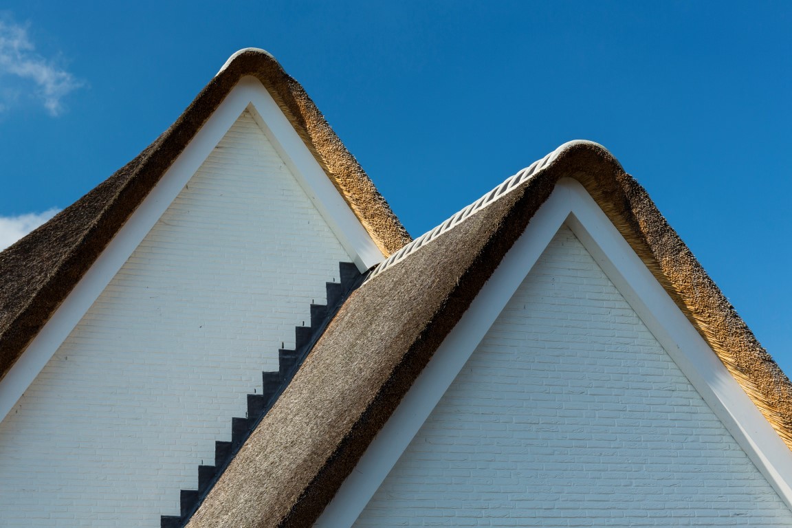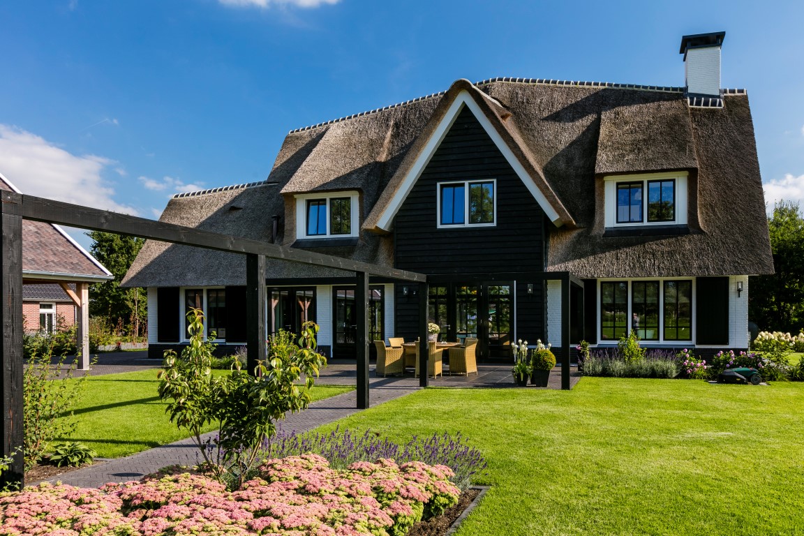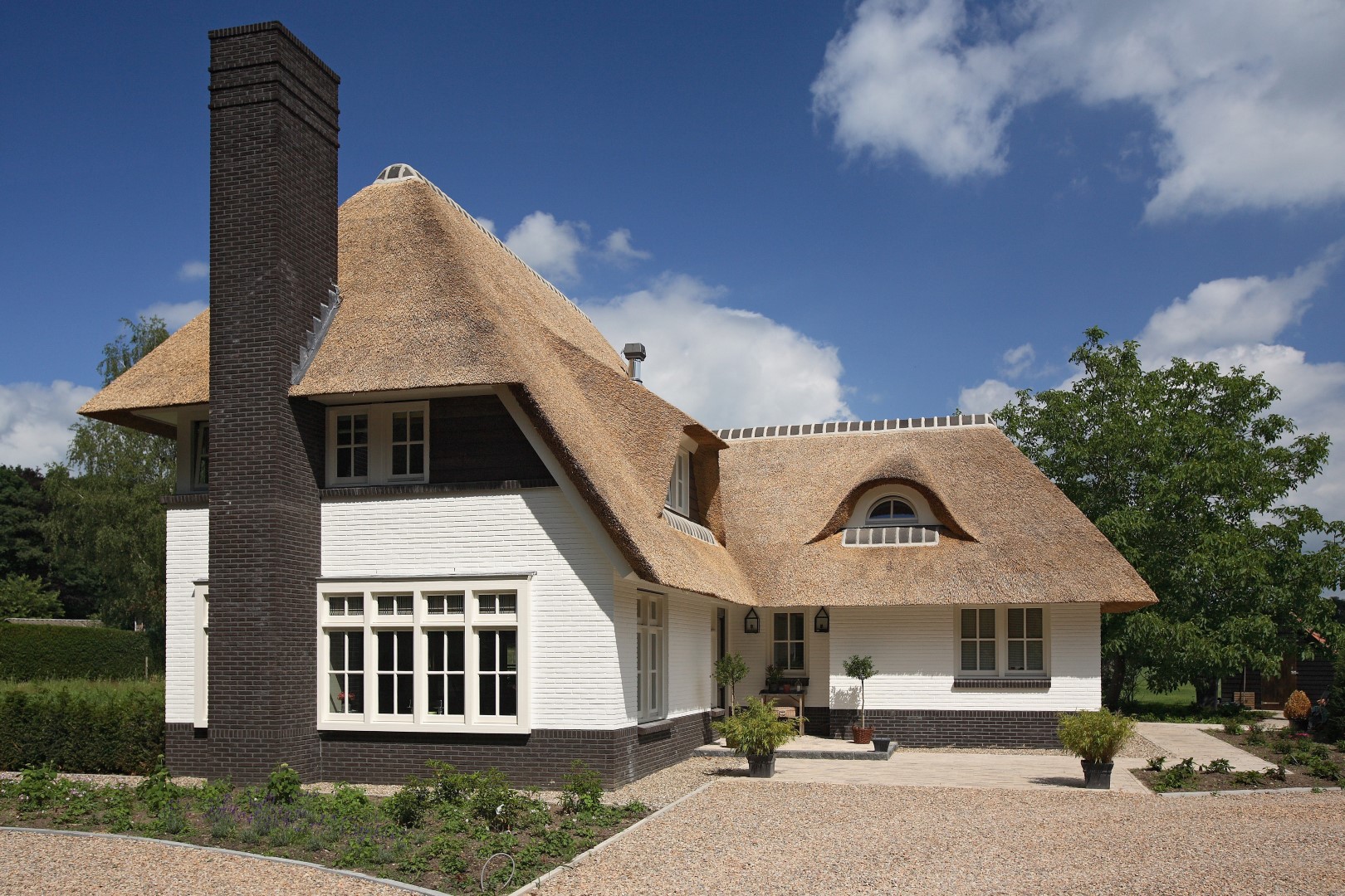 Een rietgedekt landhuis met een wel heel bijzondere kap! De combinatie van witte gevels en houten potdekselwerk geven het landhuis een stoere uitstraling.