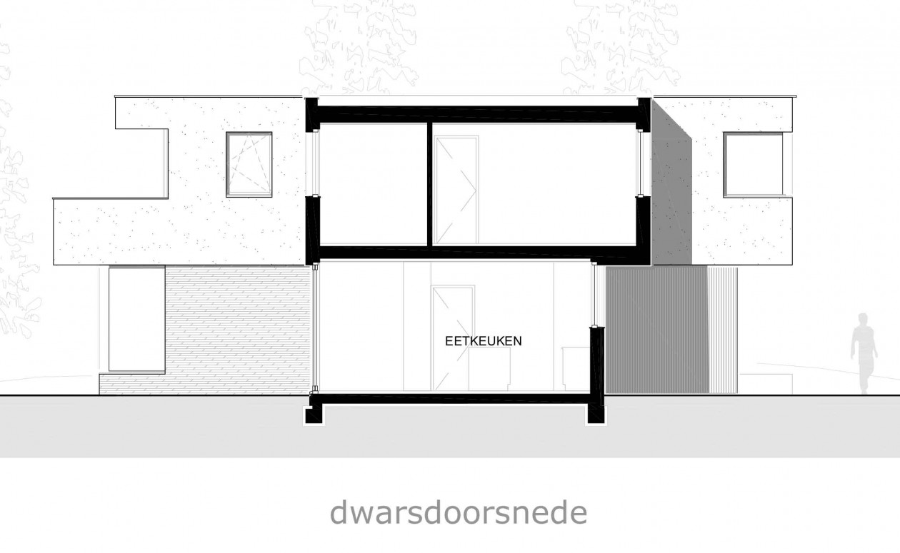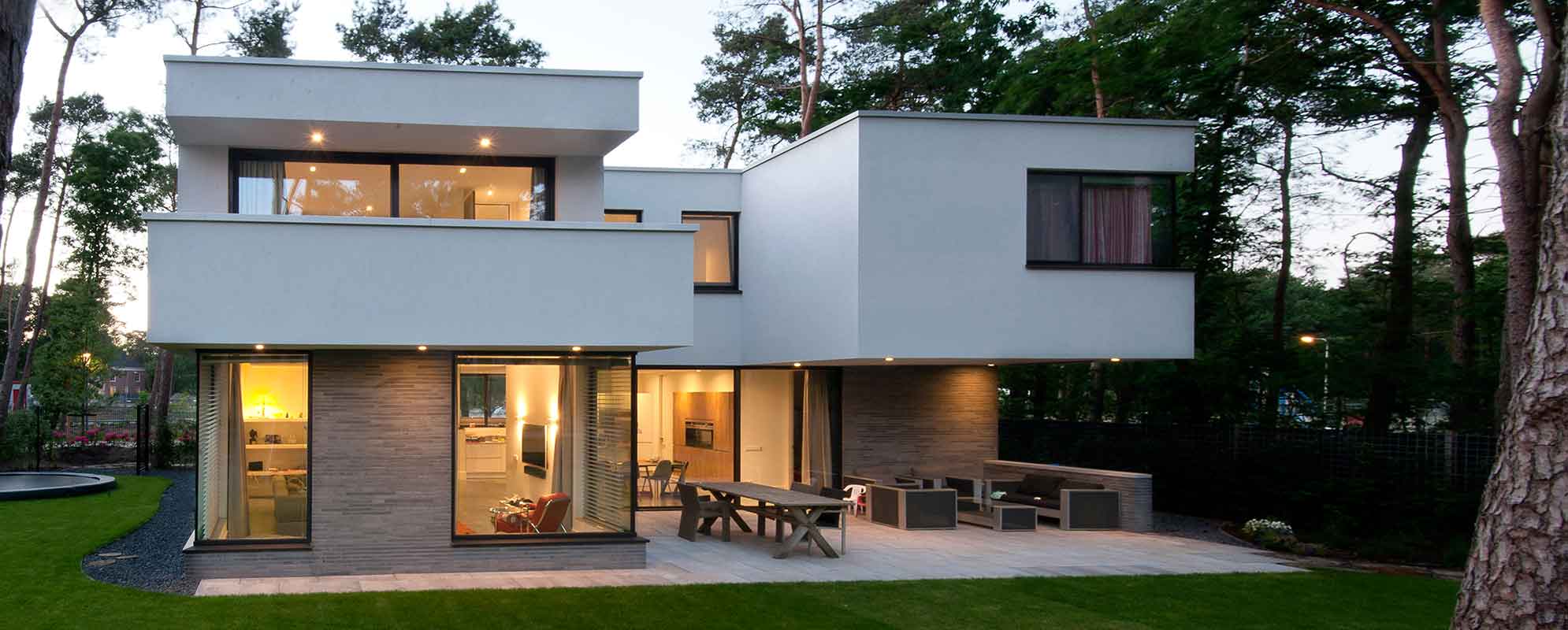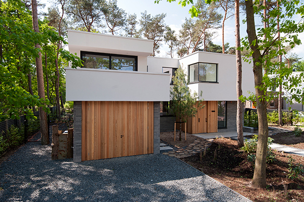 Hierdoor ontstaat er een sterke relatie tussen de villa en het bos. De tweede bouwlaag is lichtgrijs gestukt en vormt op meerdere plekken een overstek, soms meer, soms minder, waardoor het horizontale, landschappelijke karakter van de villa wordt versterkt.
