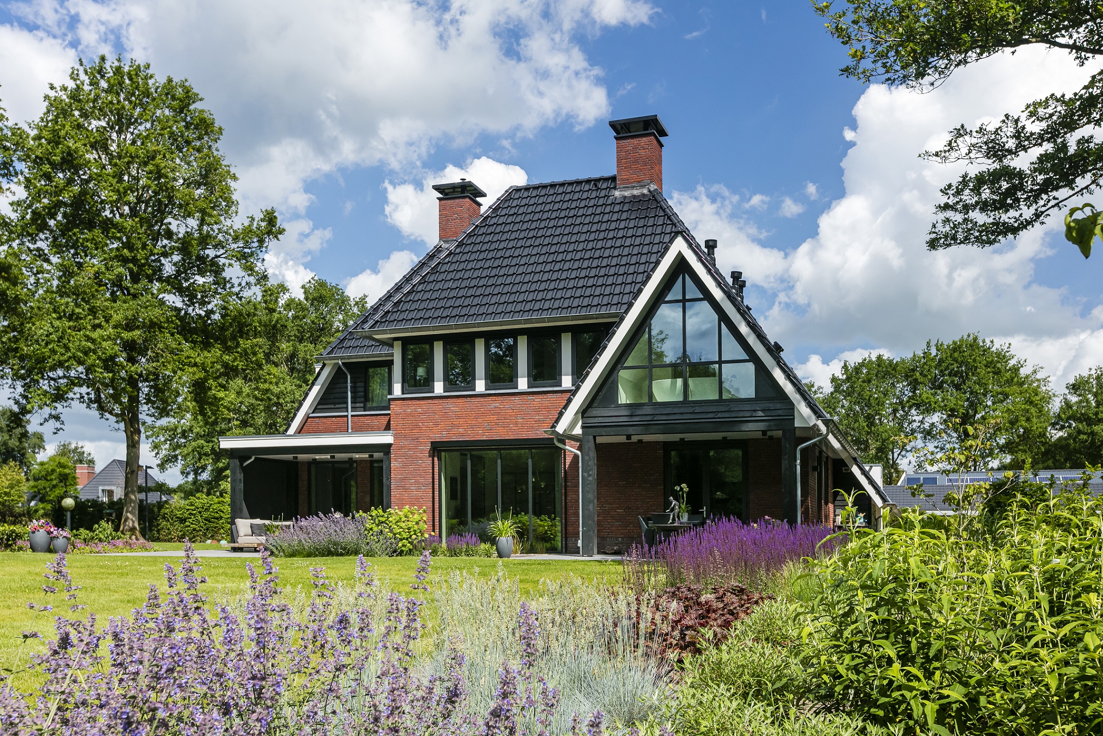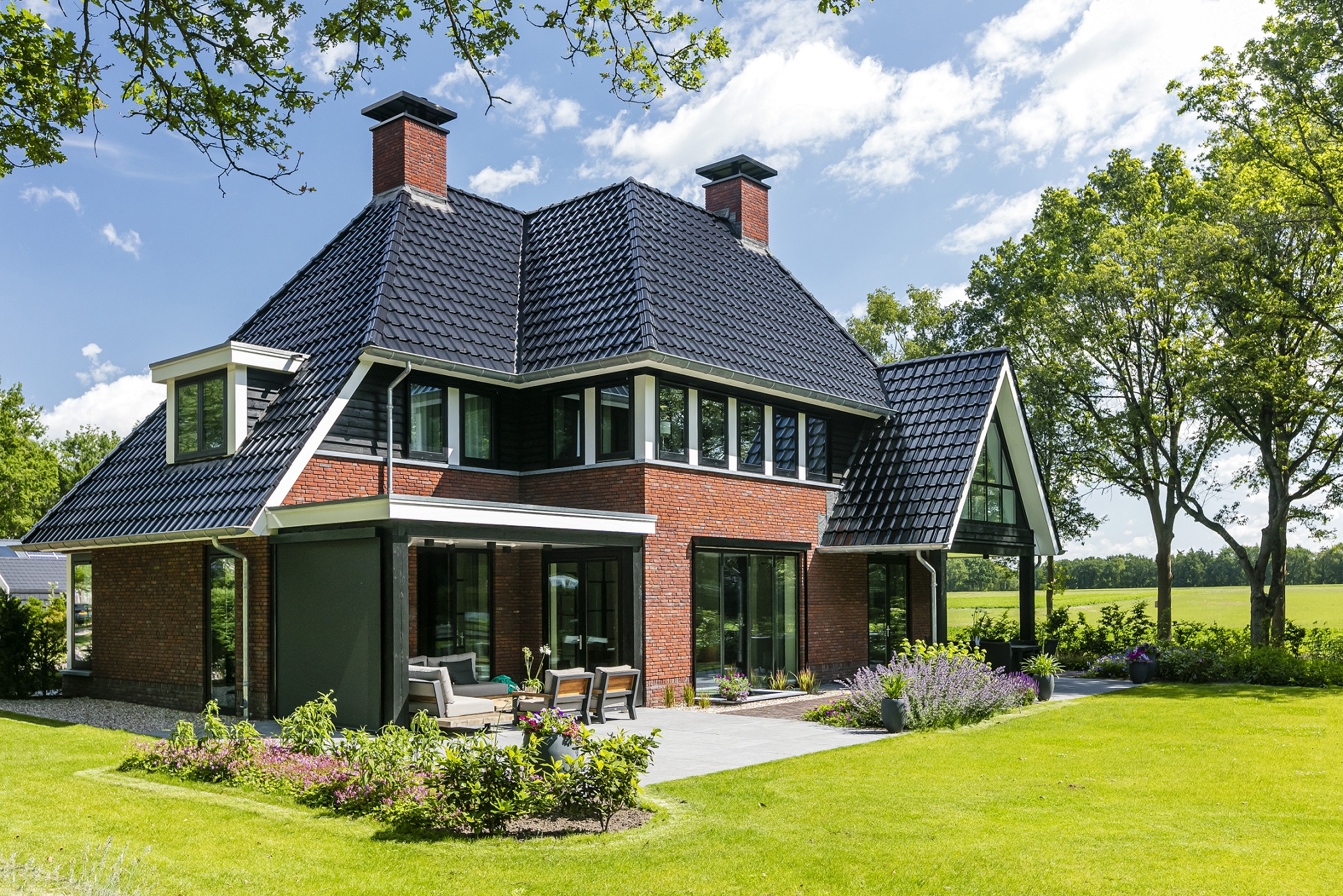 Deze prachtige landelijke villa lijkt haast op te gaan in de bosrijke omgeving. De rode bakstenen contrasteren mooi met de strakke lijnen en donkere keramische dakpannen. De verspringende indeling met twee overkapte terrassen geeft deze strakke villa net dat beetje extra in uitstraling en ruimte om te genieten. De veranda is zelfs voorzien van heaters, zodat het ook in het voor- en na seizoen en ‘s avonds heerlijk buiten leven is.