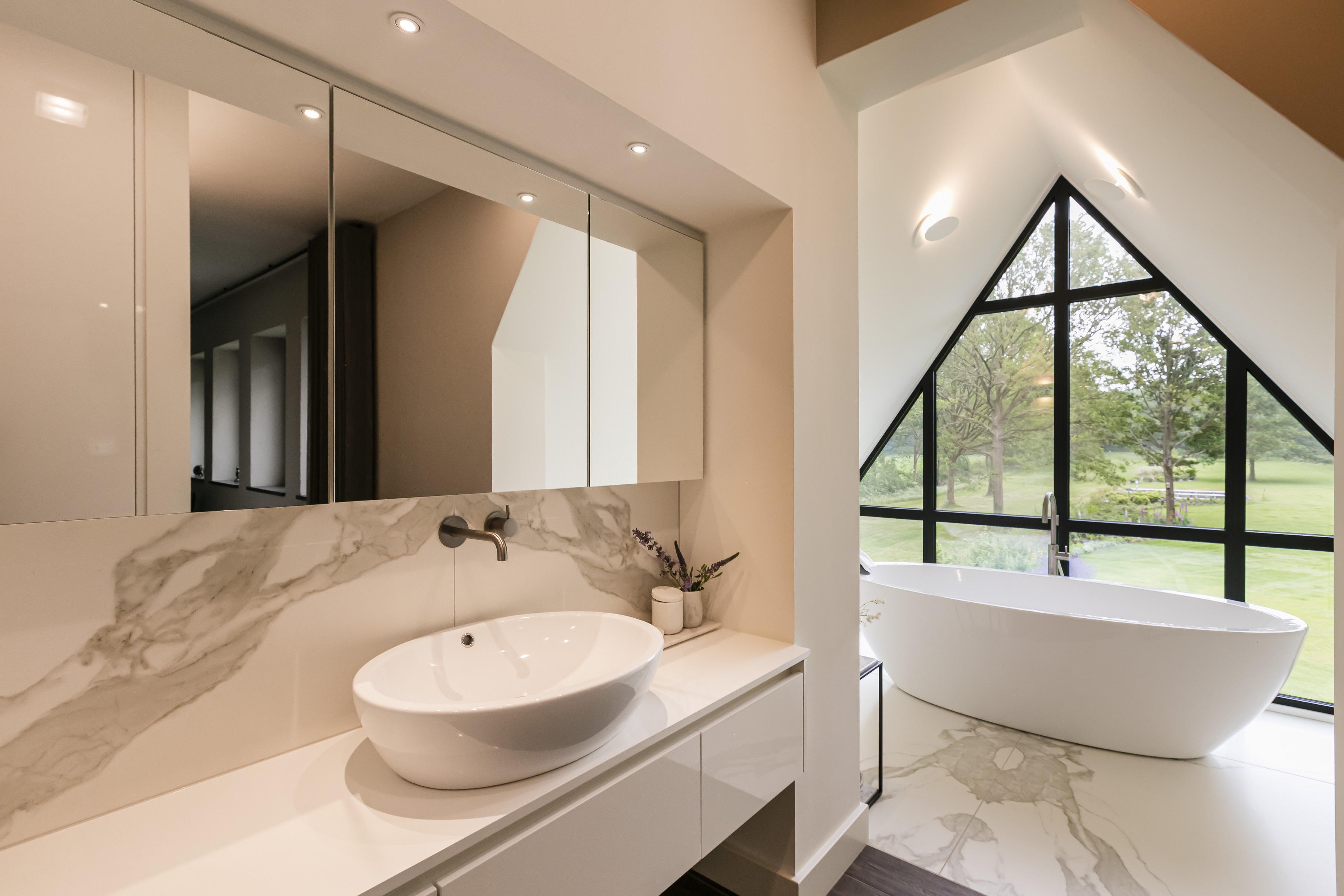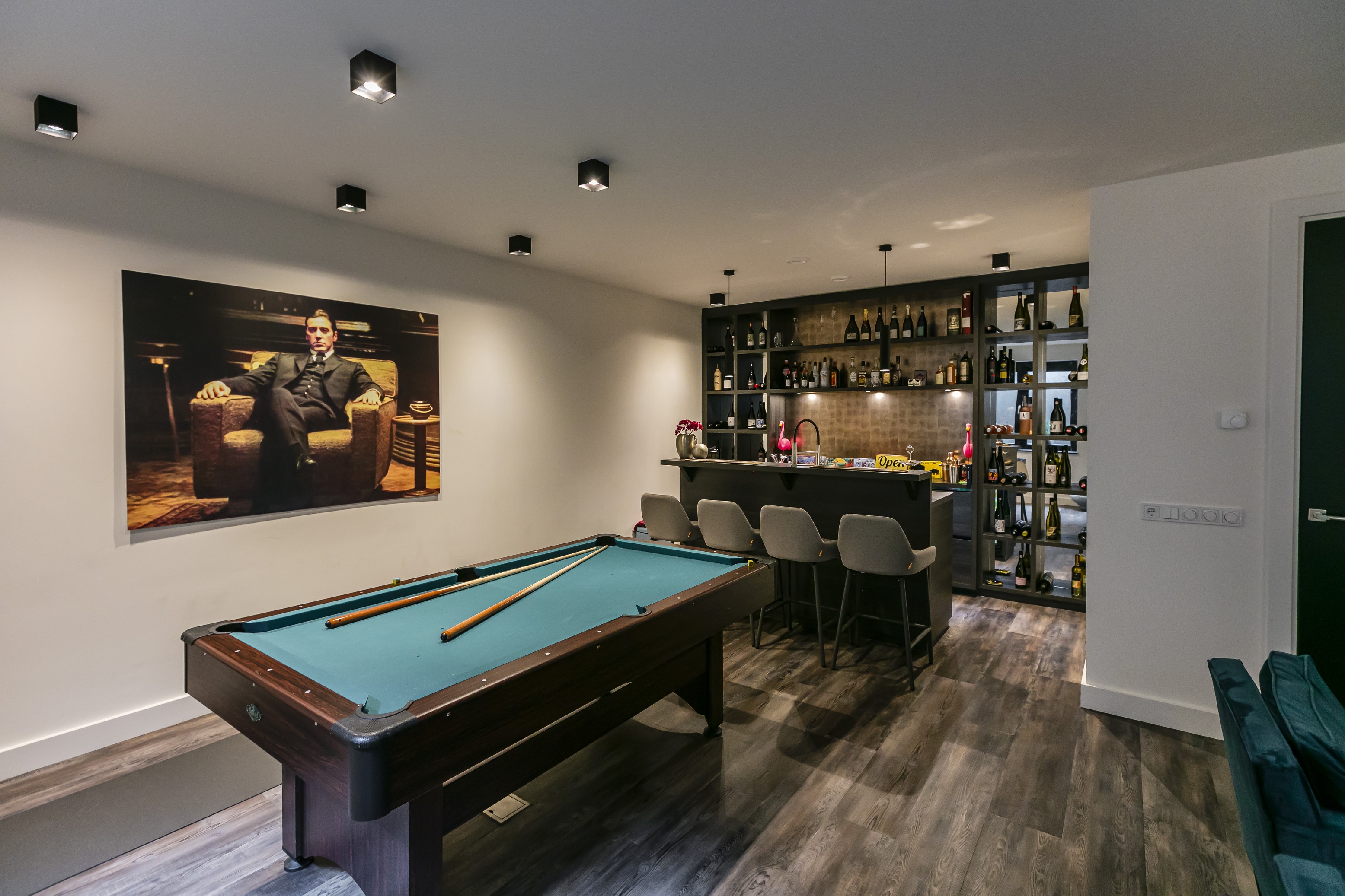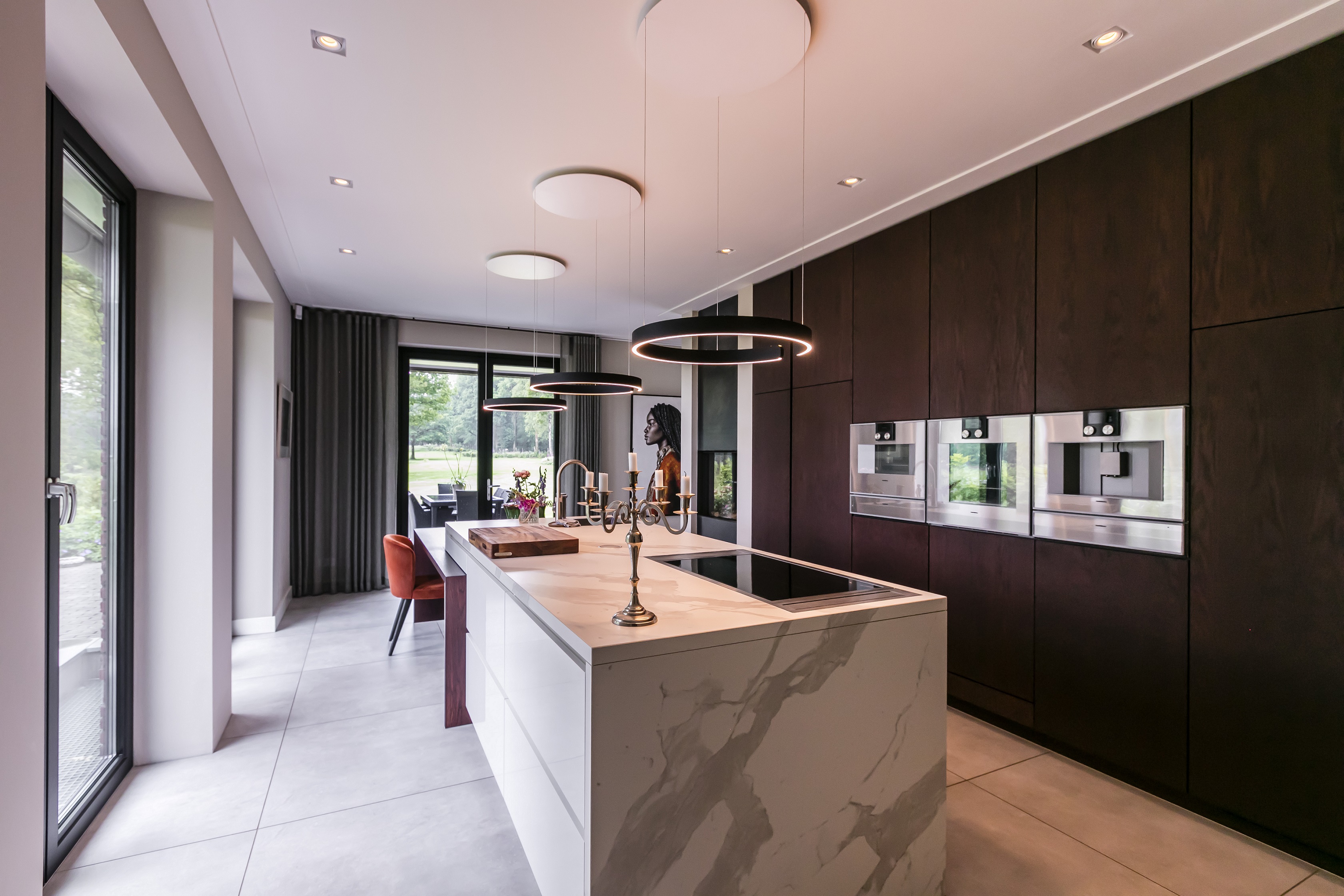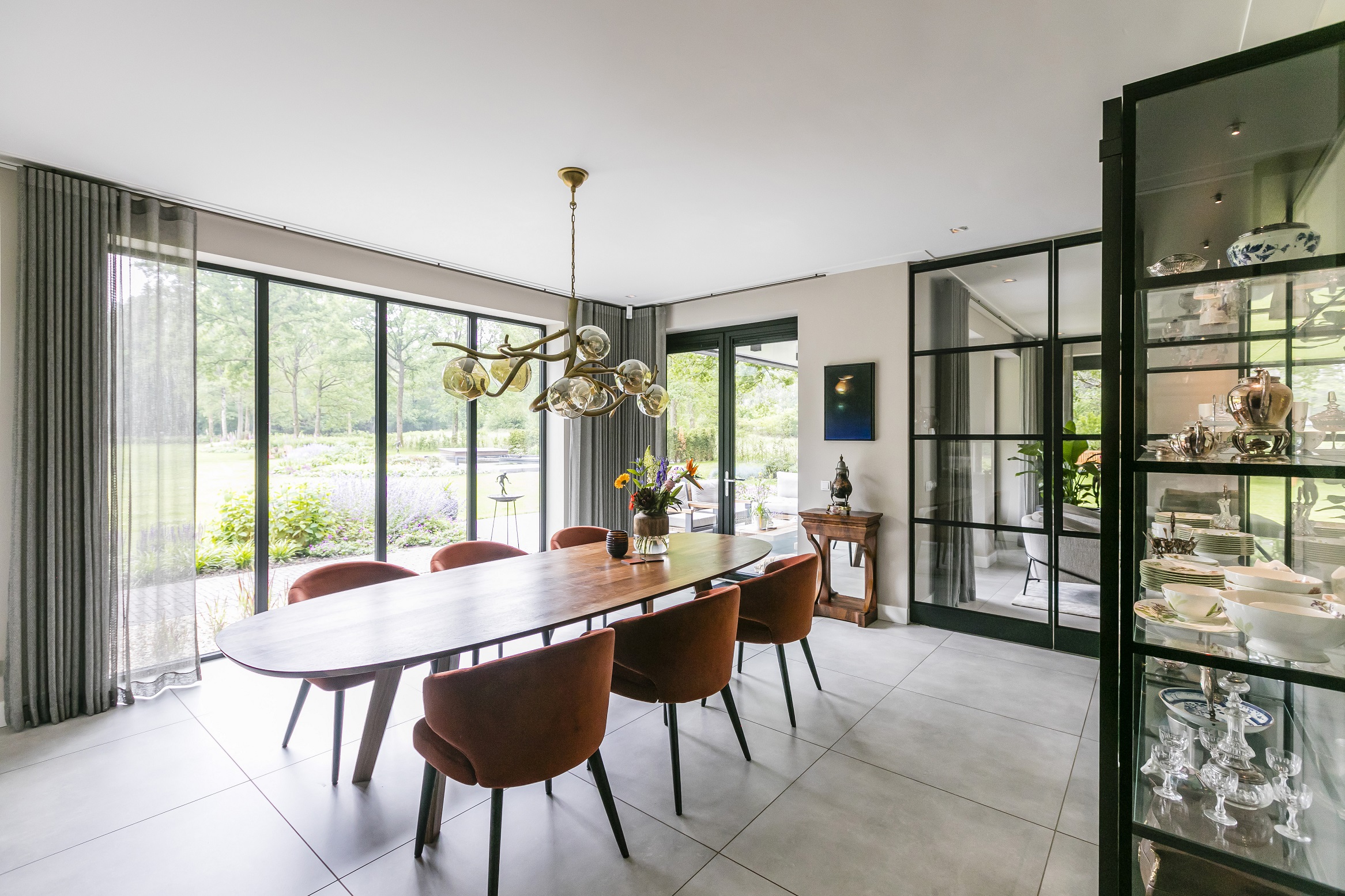 Binnen is deze sfeervolle woning juist heel licht en modern ingericht. De wit gesausde wanden gecombineerd met de strakke zwarte stalen taatsdeuren en details zorgen voor een strak en ruimtelijk effect. Tegelijkertijd bieden de haard, de architraven op de kozijnen en natuurlijk de bibliotheek een haast romantische en warme tegenhanger, wat deze comfortabele villa maakt tot een thuis. En ondanks alle luxe is dit huis 0 op de meter!