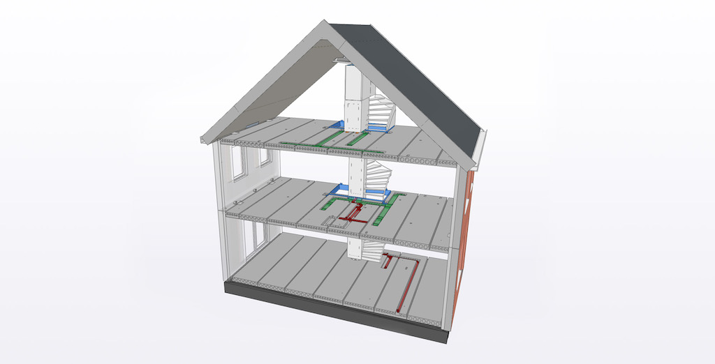 Om industrieel en modulair te kunnen bouwen, moet al aan de voorkant van het project hierop worden gestuurd. Jeroen Willems, die vanuit Hegeman Bouwgroep betrokken is bij de Modulefabriek, geeft aan dat die aansturing vooral bij architecten en projectontwikkelaars elementair bijdraagt aan standaard maatvoering om snelle, efficiënte woningen te realiseren. Met dit modulair bouwsysteem heeft de architect nog steeds alle ruimte voor interessante ontwerpen voor gevels en daken omdat hij kan variëren in beuk- en dieptematen, gevelindelingen, plattegronden en gevelafwerking. “Aan de buitenkant is van alles mogelijk en we zien dan ook dat architecten hiermee voortvarend aan het werk gaan”, zegt Willems. Gerben Geelen is naast projectleider logistiek bij Löwik, projectleider van de Modulefabriek. De Modulefabriek zet de trappen in elkaar en integreert ze met de W- en E-installaties. “Het leidingstelsel, trapgaten met trappen worden compleet in de woning geïntegreerd”, legt Geelen uit. “Binnen dit systeem zijn verschillende typen prefab installatiekolommen beschikbaar, waarin de kanaalplaatvloeren van VBI met het leidingwerk zijn geïntegreerd.” Bouwkundige en installatietechnische elementen zijn in de installatiekolommen gecombineerd en de trap inclusief trapgat is de interface met de vloer. Hierdoor zijn minder leidingvloeren en leidingen nodig voor de installaties in de woning.