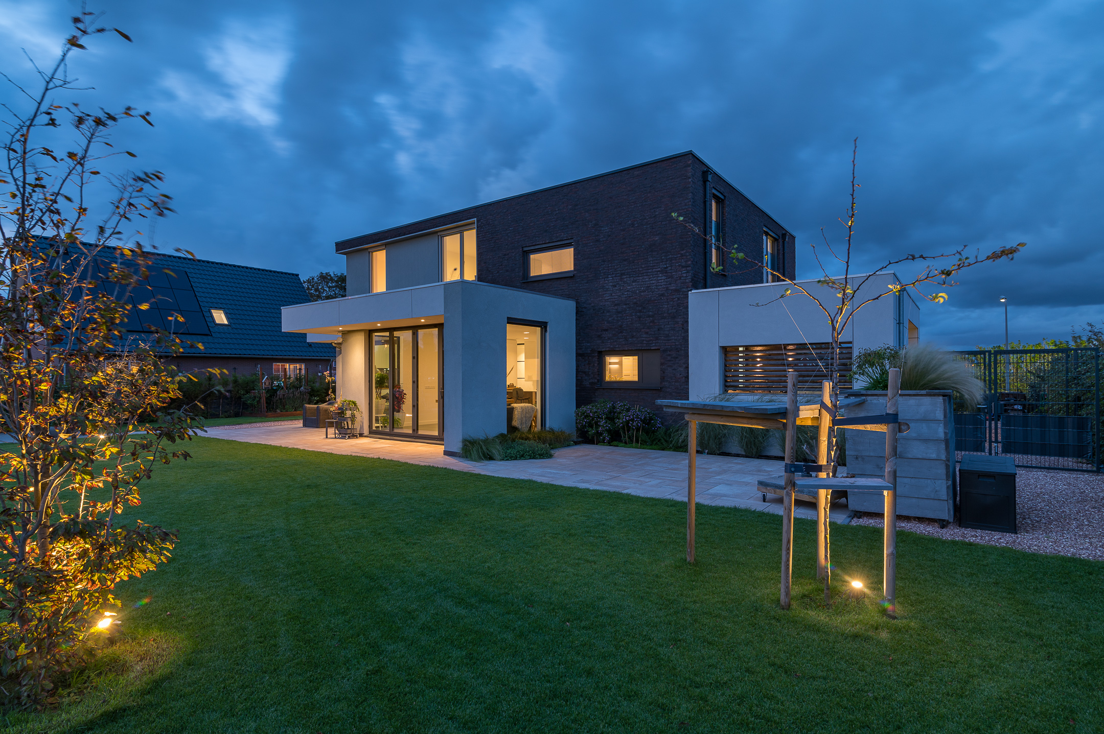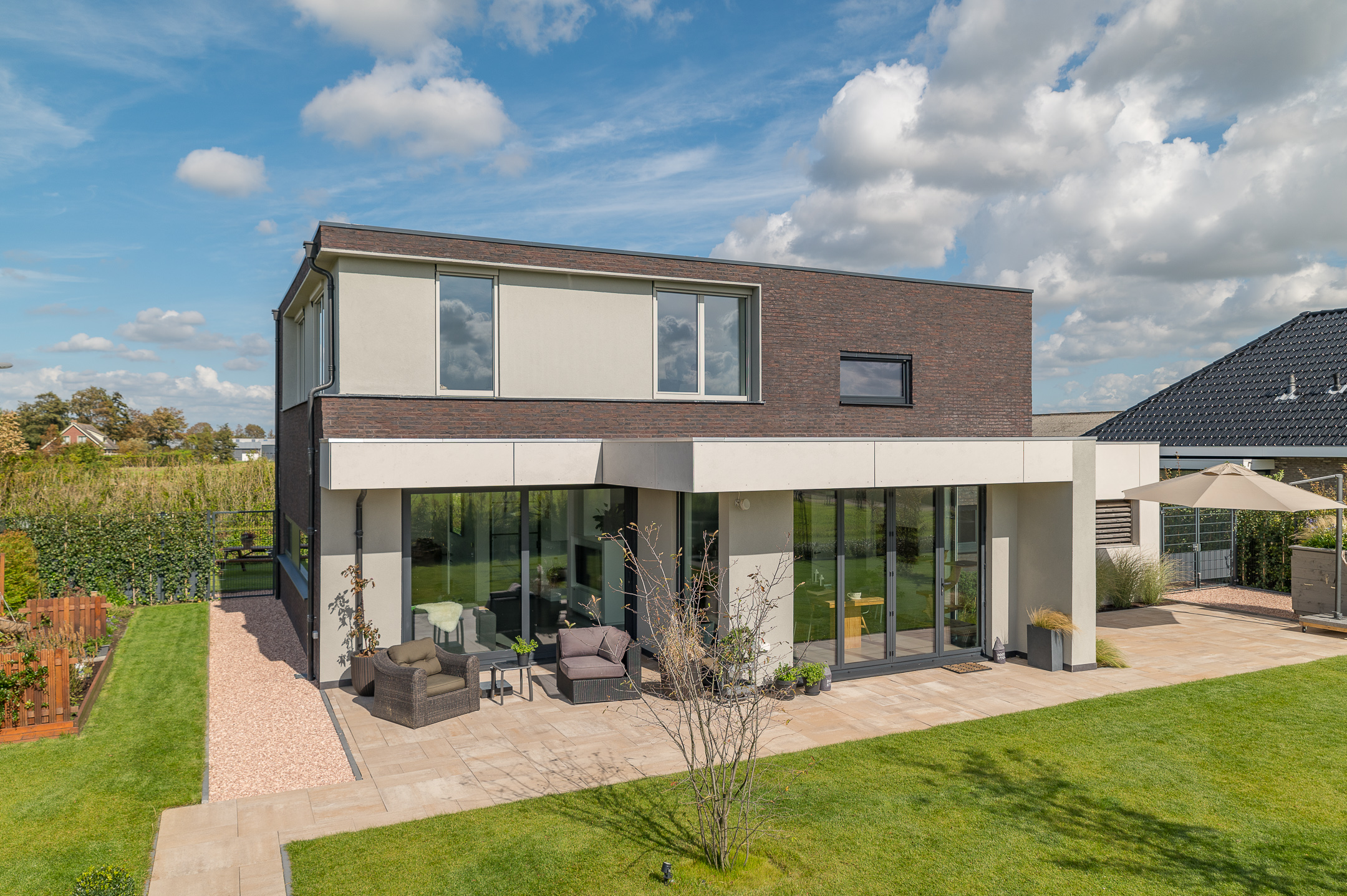 In het buitengebied, dichtbij de Zuid-Hollandse kust, is deze moderne familiewoning gerealiseerd. Aan de voorzijde, de straatkant, is de woning tamelijk gesloten, maar naar de tuin opent de woning zich met grote glaspartijen. Vanuit grote woonkeuken en zithoek kan worden genoten van de tuin en het uitzicht op de bollenvelden. De zwemvijver bidet heerlijk verkoeling op zomerse dagen.