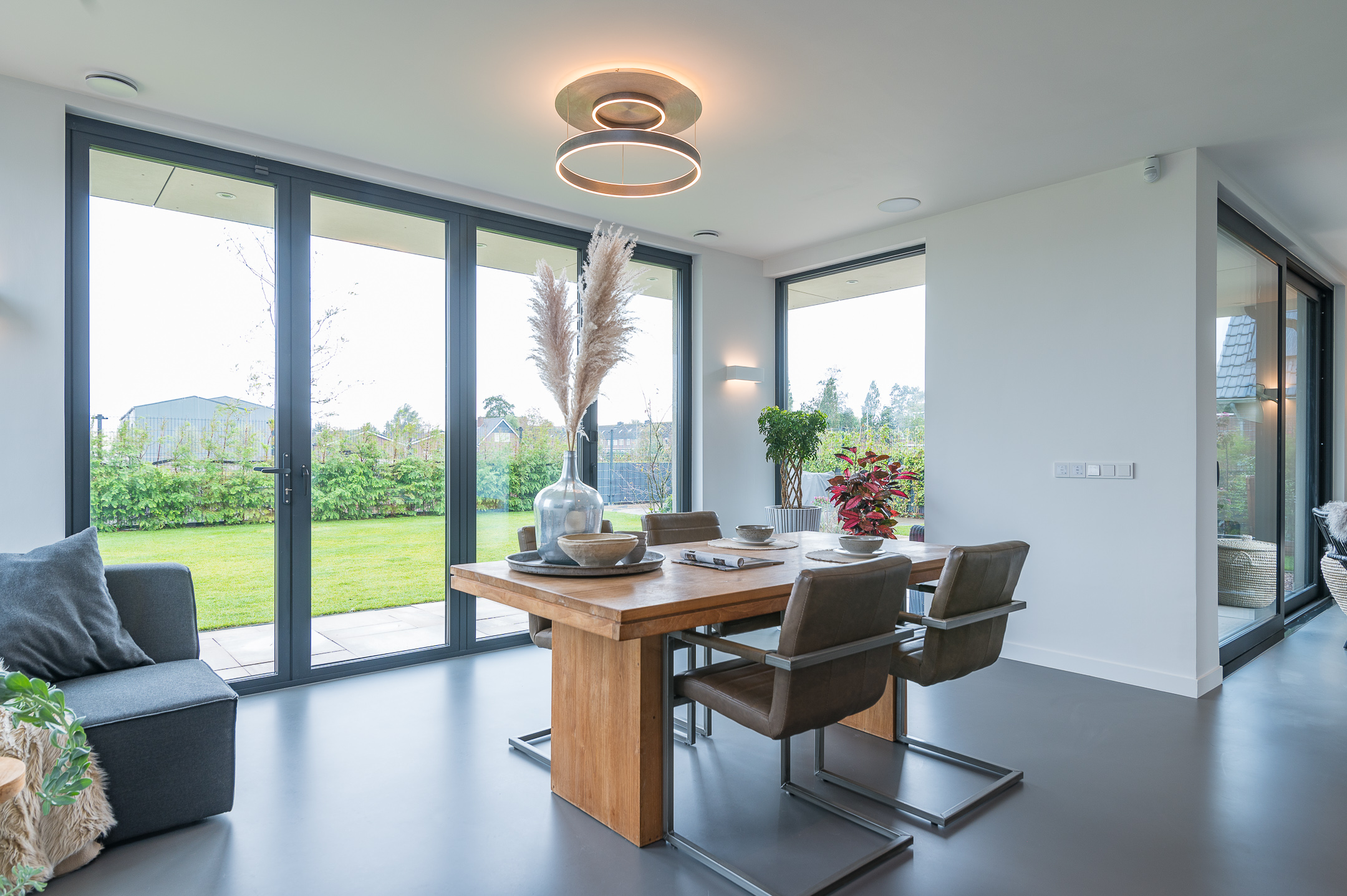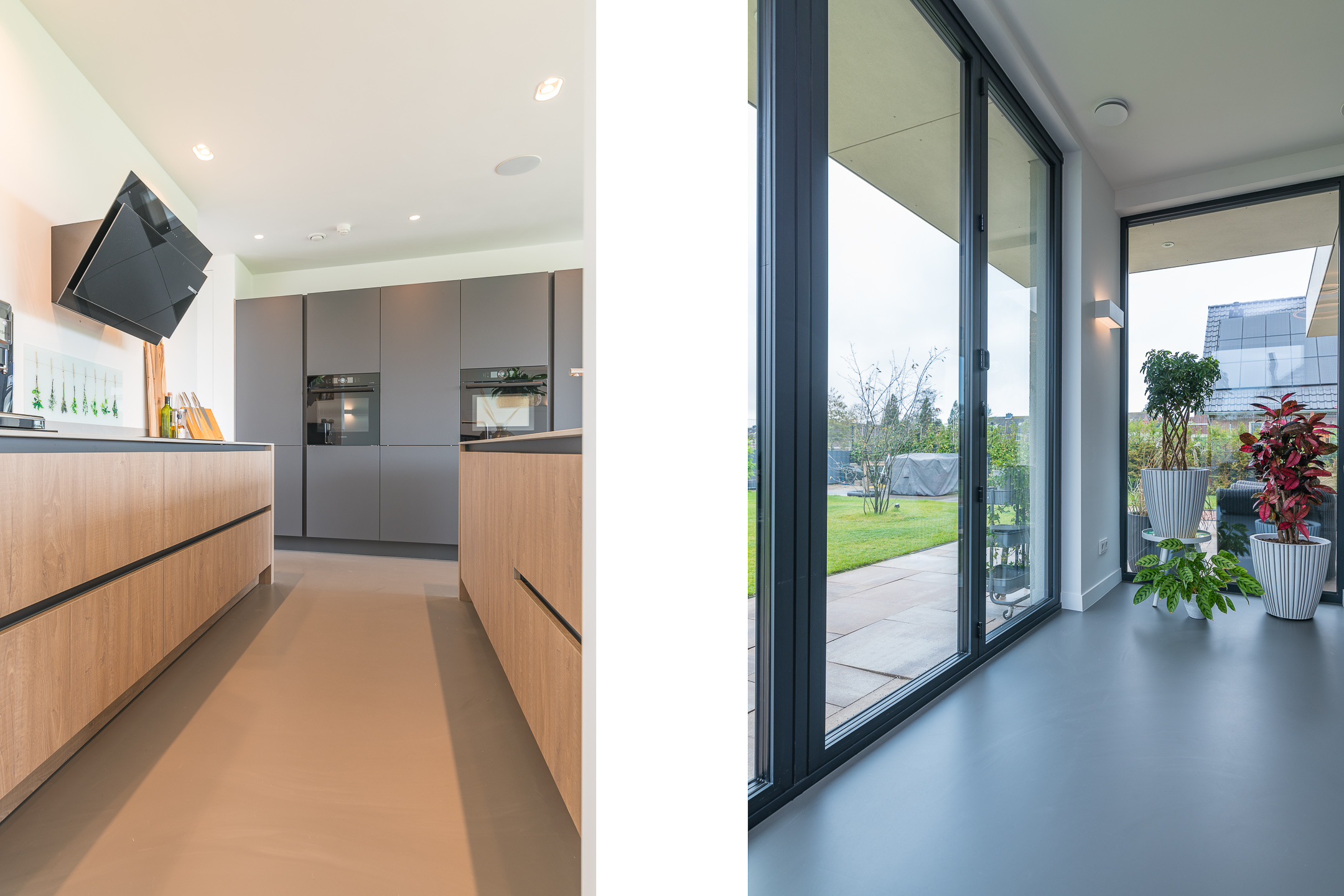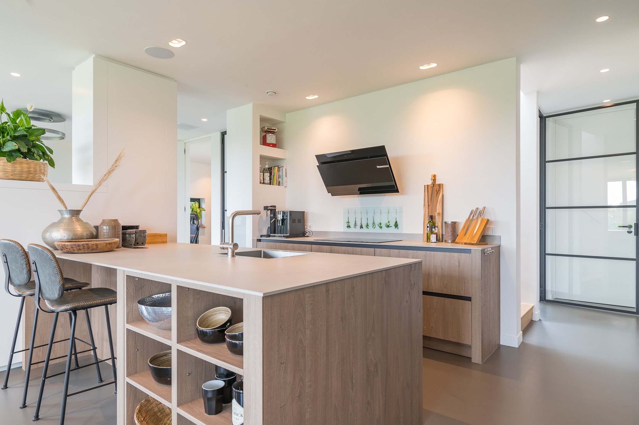 In dit ontwerp is gekozen voor een grote familiekeuken als hart van het huis. Hier speelt zich het dagelijks leven af; Ontbijten en kletsen aan het kookeiland, dineren aan de grote eettafel. Voor een extra zomers gevoel kan de vouwpui helemaal open, waardoor binnen en buiten geheel in elkaar overlopen. De grote overstekken bieden beschutting tegen de zon en geven het terras een intieme sfeer.