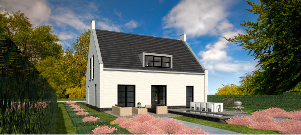 De entree van dit ontwerp wordt benadrukt door middel van het risaliet. De horizontale lijnen van het kozijn door middel van de roeden geven de woning een strakke uitstraling. De woning wordt gekarakteriseerd door openheid, ruimte en veel lichtinval.