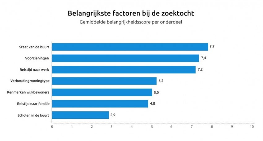 Als het gaat om wat de belangrijkste factor is in de zoektocht naar een woning op een geschikte locatie, dan voeren de staat van de buurt, de voorzieningen en de reistijd naar werk de top drie aan. Onder ‘staat van de buurt’ wordt verstaan of de buurt veilig, schoon en goed verzorgd is. De mate van belangrijkheid hangt samen met leeftijd: hoe ouder woningzoekenden zijn, hoe belangrijker de staat van de buurt wordt. Jongeren onder de 25 jaar vinden de reistijd naar werk en de aanwezigheid van voorzieningen doorslaggevend in hun keuze. Echter hechten zij minder waarde aan de buurt, terwijl mensen in leeftijdscategorieën tussen de 35 en 65 jaar de staat van de buurt op nummer één zetten. Reistijd naar werk komt voor hen op de derde plek.