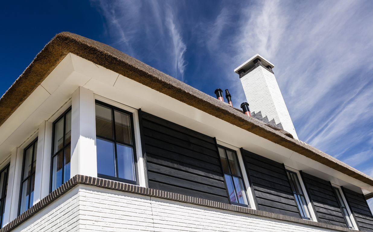 Een royale rietgedekte villa met asymmetrische kap te Aerdenhout, wit gekeimd, modern uitgevoerd