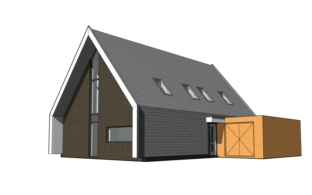 In dit ontwerp is gekozen voor een mansardekap die de gehele hoofdbouw omsluit en bijna tot aan het maaiveld doorloopt. De robuuste windveer accentueert de dakvorm. Uiteraard zijn er tal van mogelijkheden qua uitstraling, materialen, afwerking en indeling. In dit ontwerp is de zijgevel gesloten met dakpannen maar dit kan desgewenst ook met meer openheid uitgevoerd worden. De garage/aanbouw is ontworpen in een contrastkleur, passend bij de hoofdbouw.