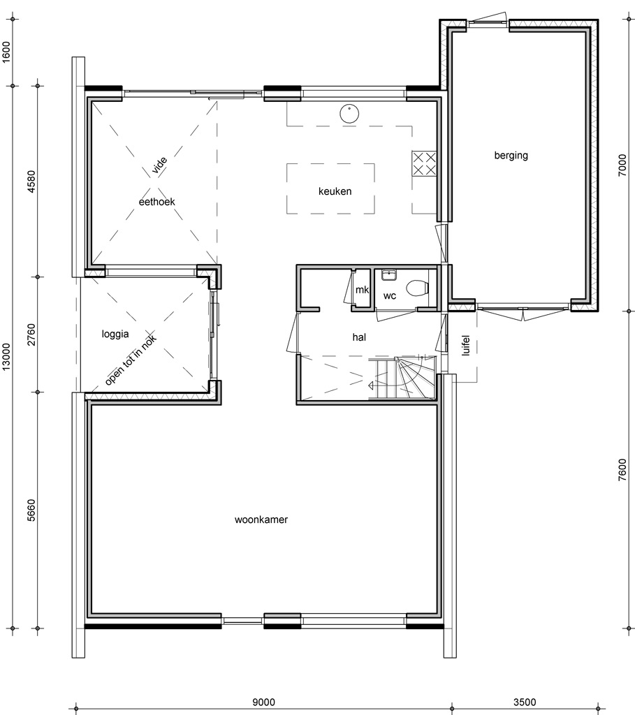 De royale woonkamer beslaat de hele voorzijde van de woning. De achterzijde biedt ruimte aan een grote woonkeuken met eethoek. De vide boven de eethoek zorgt niet alleen voor veel lichtinval maar ook voor een ruimtelijk effect waarbij de loggia in de zijgevel voor een bijzondere plek in deze woning zorgt.