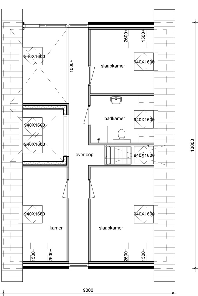 Door de vide en de loggia heeft de verdieping een speelse indeling gekregen die ruimte biedt aan 3 slaapkamers en een badkamer.
