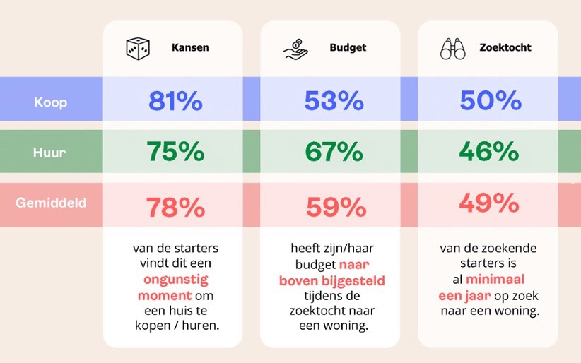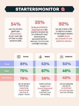 Ruim 6.300 respondenten vulden afgelopen zomer de vragenlijst in. Uit de uitkomsten blijkt onder meer dat 8 op de 10 starters de huidige markt als ongunstig kwalificeert. Maar liefst 92% van de starters die nu bij hun ouders woont, woont liever op zichzelf. Starters geven zichzelf verder een slagingskans van slechts 35 procent. Ruim de helft van de starters is bovendien ontevreden over de huidige woonsituatie. Bijna de helft zoekt al langer dan een jaar naar een woning. 13% zelfs langer dan drie jaar.