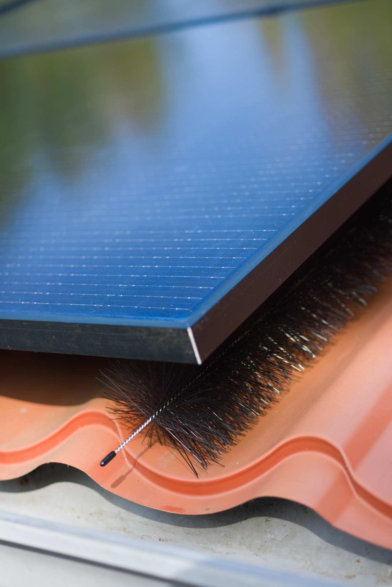 De draden zijn gemaakt van zwart polypropyleen (PP) en bevestigd aan een stang van rvs (SS304). De dakgootbeschermer wordt ook gebruikt bij de plaatsing van zonnepanelen. Hij wordt dan aangebracht tussen de panelen en het dak om vogelnesten te voorkomen.