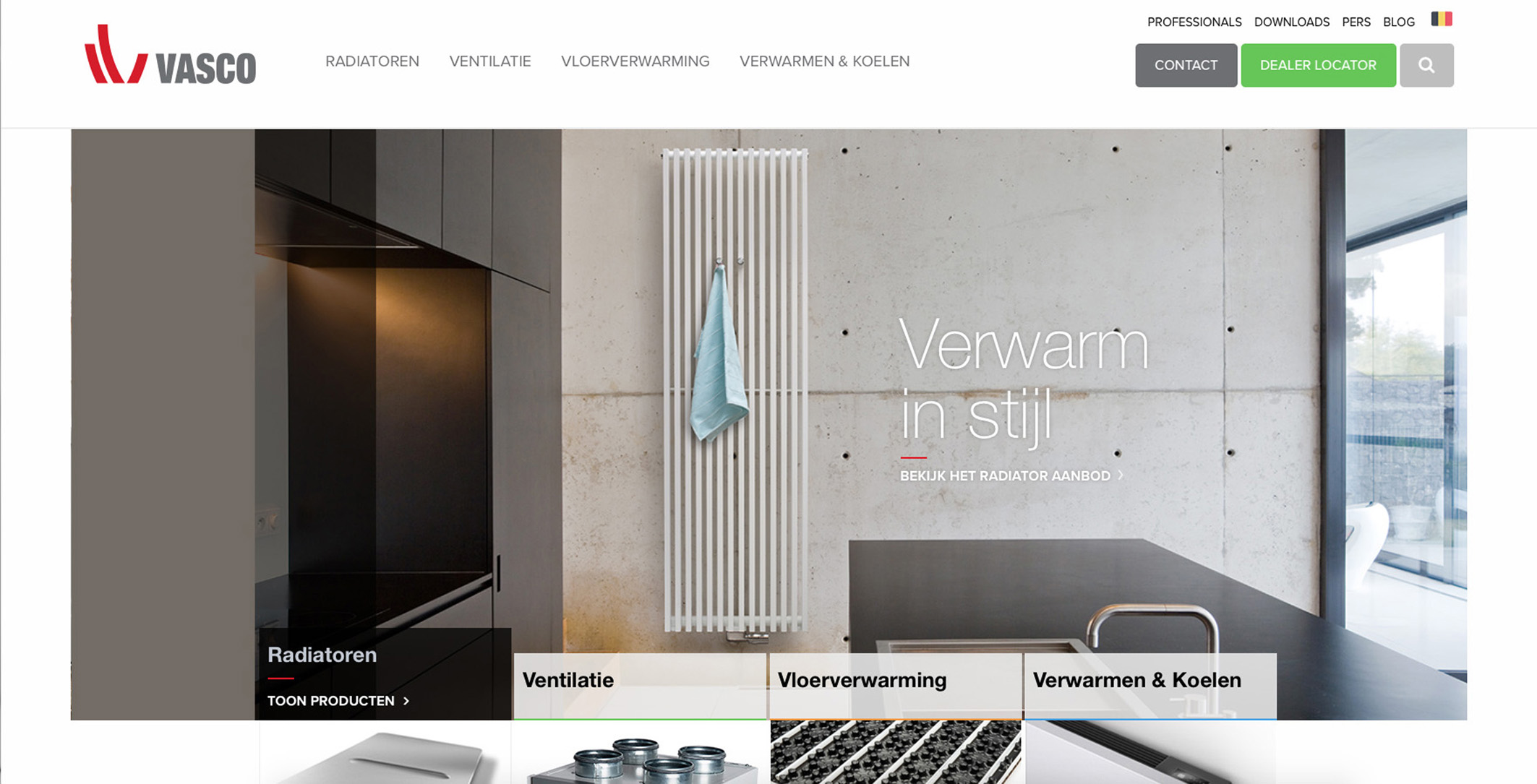 De nieuwe Vasco-website is een digitale toonzaal voor de eindklant. Alle productgroepen (radiatoren, vloerverwarming, ventilatie, verwarming en koeling) krijgen een prominente plek in de hoofdnavigatie. Naast technische informatie biedt de website een weelde aan inspiratie voor particulieren, met schermvullende sfeerbeelden, downloadbare brochures en geïntegreerde Youtube-filmpjes. Kortom: alle ingrediënten zijn aanwezig voor een dynamische online beleving.