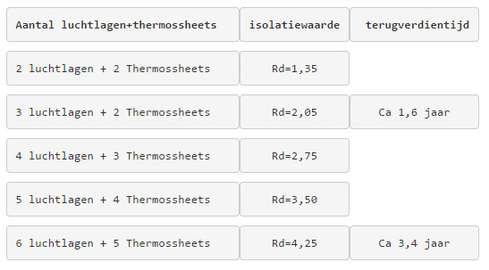 Je kunt zelf bepalen hoe hoog je de isolatiewaarde wilt hebben. De waarde wordt namelijk bepaald door het aantal luchtlaagjes dat met de Thermossheet van elkaar wordt gescheiden. Hoe meer luchtlagen hoe hoger de muurisolatie waarde. Je moet minimaal twee luchtlagen met twee thermossheets gebruiken. Gebruik je minder dan bestaat de kans dat de muur kouder is dan het dubbelglas, waardoor eventuele condensatie onzichtbaar op de muren neerslaat. Condensatie die je beter zichtbaar op je ramen kunt hebben, zodat je weet dat je wat meer moet luchten. Onderstaand de isolatiewaarden die je met muurisolatie kunt bereiken en de terugverdientijd.