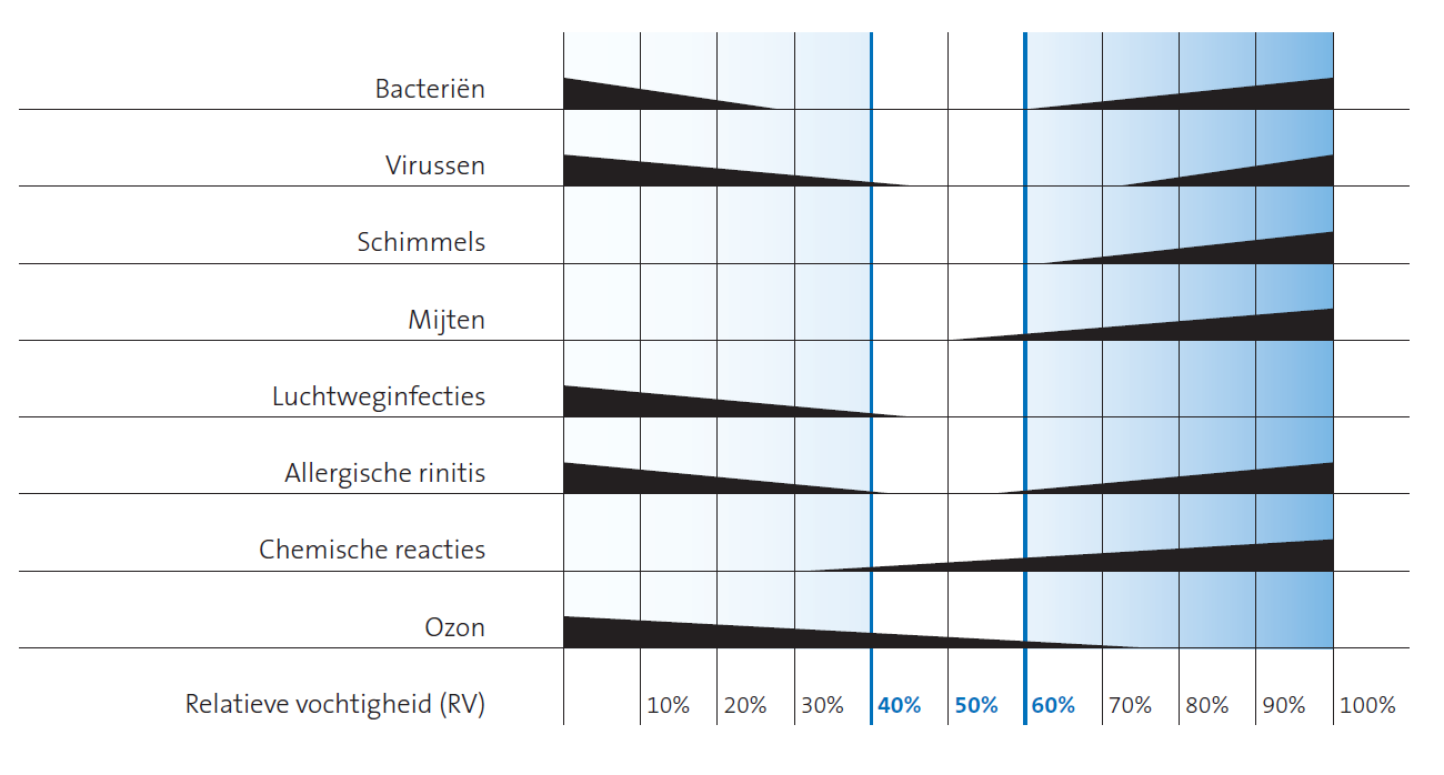 Een recente studie, uitgevoerd door het Amerikaanse "National Institute for Occupational Safety & Health" (NIOSH) heeft aangetoond dat de verspreiding van het griepvirus door de lucht aanzienlijk wordt verminderd wanneer een luchtvochtigheid van 40% of hoger in stand wordt gehouden.