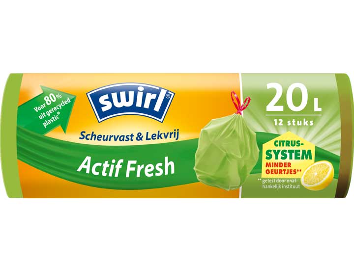 Swirl® Actif Fresh is verkrijgbaar in de supermarkt. Ga naar www.swirl.nl voor meer informatie. Adviesprijs 20 L, 12 stuks € 2,12 en 30 L, 9 stuks € 2,12.