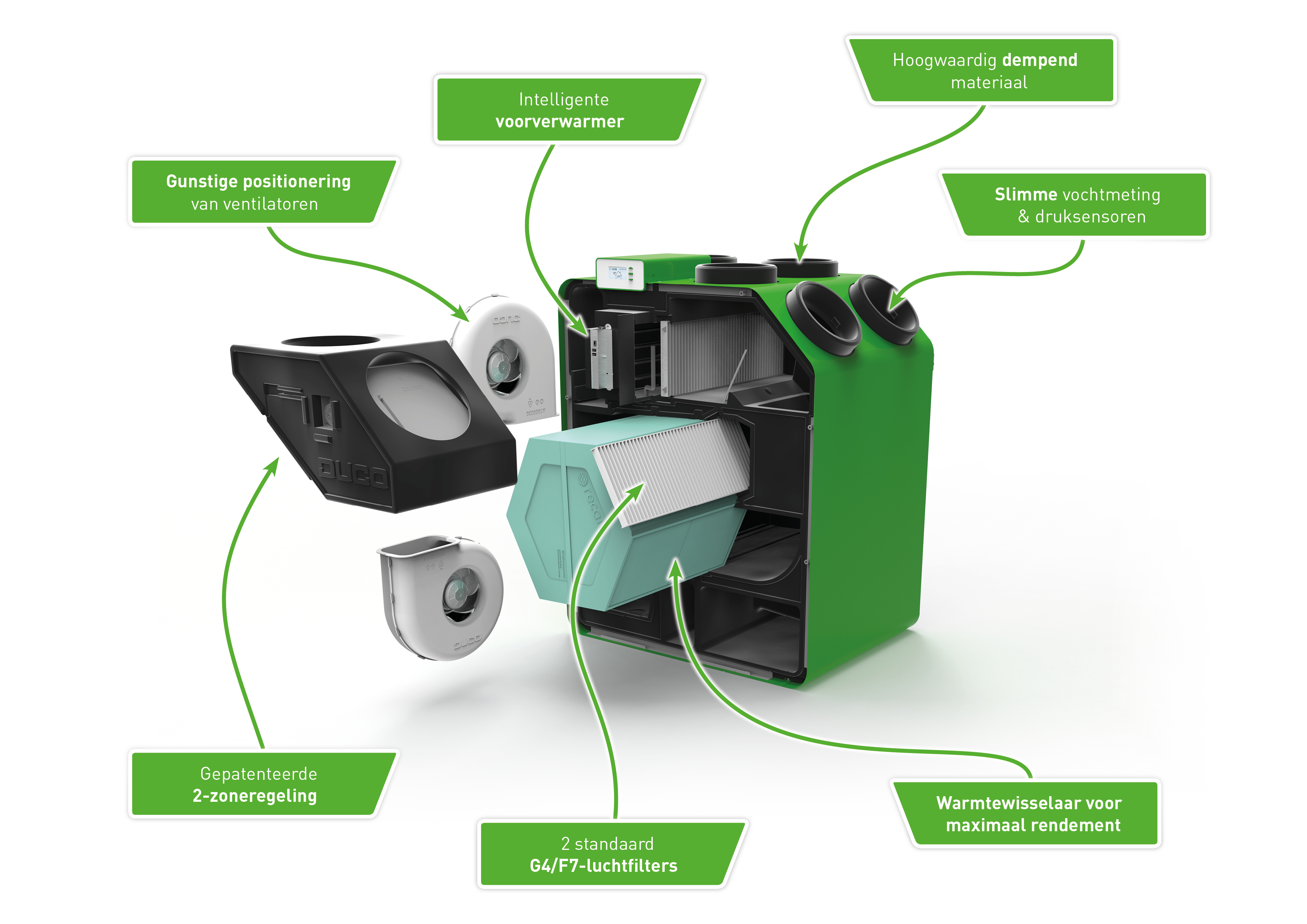 Energiezuinigheid wordt een steeds belangrijker gegeven. Zeer energiezuinige passiefwoningen zullen steeds vaker in ons straatbeeld verschijnen. In de strijd tegen de aanscherping van de energienormen kan de nieuwe DucoBox Energy Premium een belangrijk wapen vormen. Met alle technologie die is vervat in deze ventilatiebox, wordt de DucoBox Energy Premium meteen aangezien als voorloper in de markt van balansventilatie met warmteterugwinning. Het is dan ook de combinatie van drie specifieke kenmerken die de DucoBox Energy Premium zo uniek maakt.