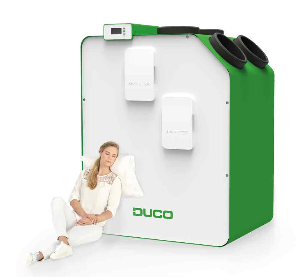 Maar ook aan het akoestische comfort voor de bewoner is gedacht, want hoe vaak gebeurt het niet dat de stekker uit het ventilatiesysteem wordt getrokken? Met de DucoBox Energy Premium behoort dit voortaan tot het verleden. Dankzij diverse inspanningen om het geluidsvermogen minimaal te houden zoals de geïntegreerde 2-zoneregeling, een gunstige positionering van de ventilatoren, en het gebruik van hoogwaardig dempend materiaal kan Duco zwart op wit (55 dB bij 325 m³/u) aantonen dat de DucoBox Energy Premium zich effectief de ‘stilste WTW-unit van Europa’ mag noemen. Die cijfergegevens zeggen u waarschijnlijk niet zoveel, maar neem het van ons aan: met de DucoBox Energy Premium kunt u écht op de beide oren slapen!