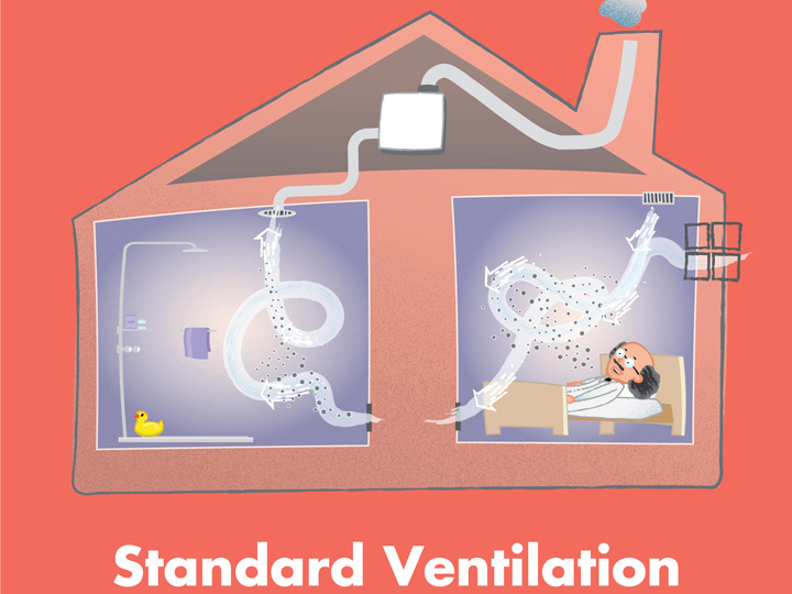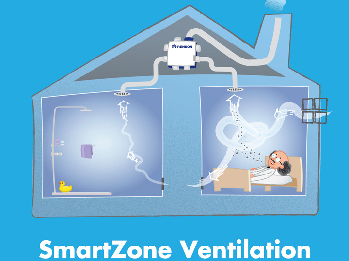 Smartzone ventilatie zorgt voor ventilatie op maat. In een volledig gebouw wordt niet overal per definitie evenveel vervuilde binnenlucht afgevoerd, maar gebeurt dat op basis van de binnenluchtkwaliteit per ruimte. Hoe slechter die er aan toe is, hoe meer er per ruimte geventileerd wordt. Dat zorgt niet alleen voor een energiezuinig systeem, maar het geeft je ook de kans om een zieke persoon af te zonderen in één kamer om verdere verspreiding van virussen te voorkomen. De vervuilde binnenlucht uit die kamer wordt namelijk bij de bron aangepakt en rechtstreeks naar buiten afgevoerd. In combinatie met de natuurlijke toevoer van verse lucht in diezelfde ruimte, wordt de vervuilde binnenlucht met andere woorden geïsoleerd, waarbij de kans tot verspreiding van besmette deeltjes over een volledig gebouw tot een minimum beperkt wordt. (zie tekening)