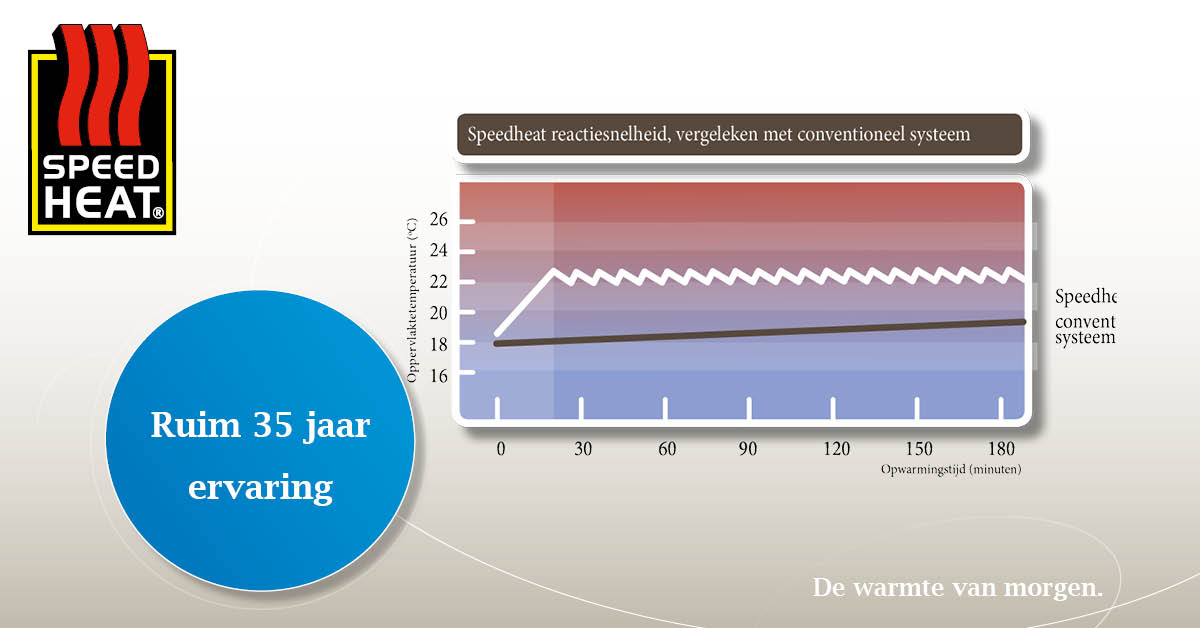 De warmtepomp heeft een hoog rendement, maar om een rendement echt te vergelijken moet u niet alleen kijken naar de opwekker maar naar het gehele verwarmingssysteem. Het netto rendement van de warmtepomp ligt dan een stuk lager door het transportverlies via de buizen en de trage reactietijd van het vloerverwarmingssysteem op water. Bij Speedheat wordt elektrische energie zonder verlies omgezet in warmte!