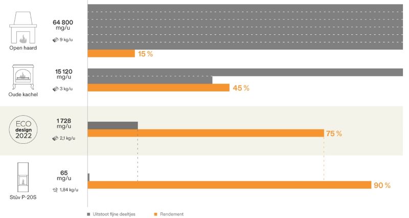 Dankzij zijn rendement van 90% enerzijds en de vrijwel niet detecteerbare uitstoot van fijn stof en CO anderzijds is de Stûv P-20s een performantere kachel dan de Ecodesign 2022-norm. Tijdens officiële tests uitgevoerd door gespecialiseerde onafhankelijke laboratoria is gebleken dat de nieuwe kachel bijna 1.000 keer minder fijn stof uitstoot dan een open haard …