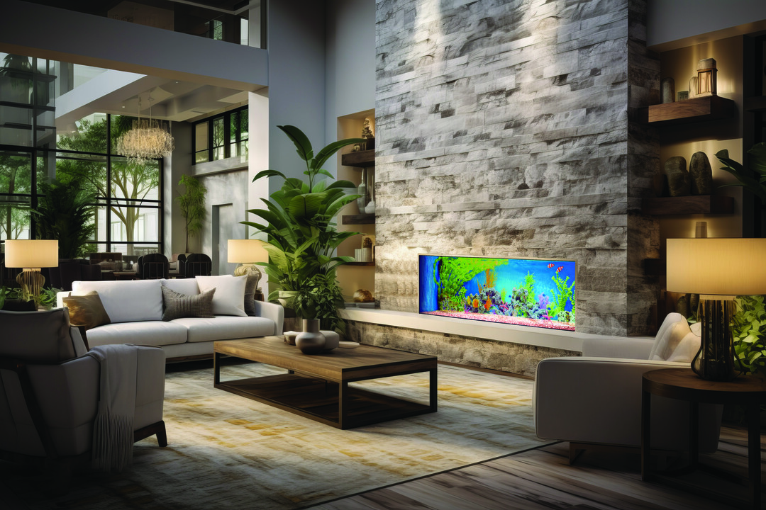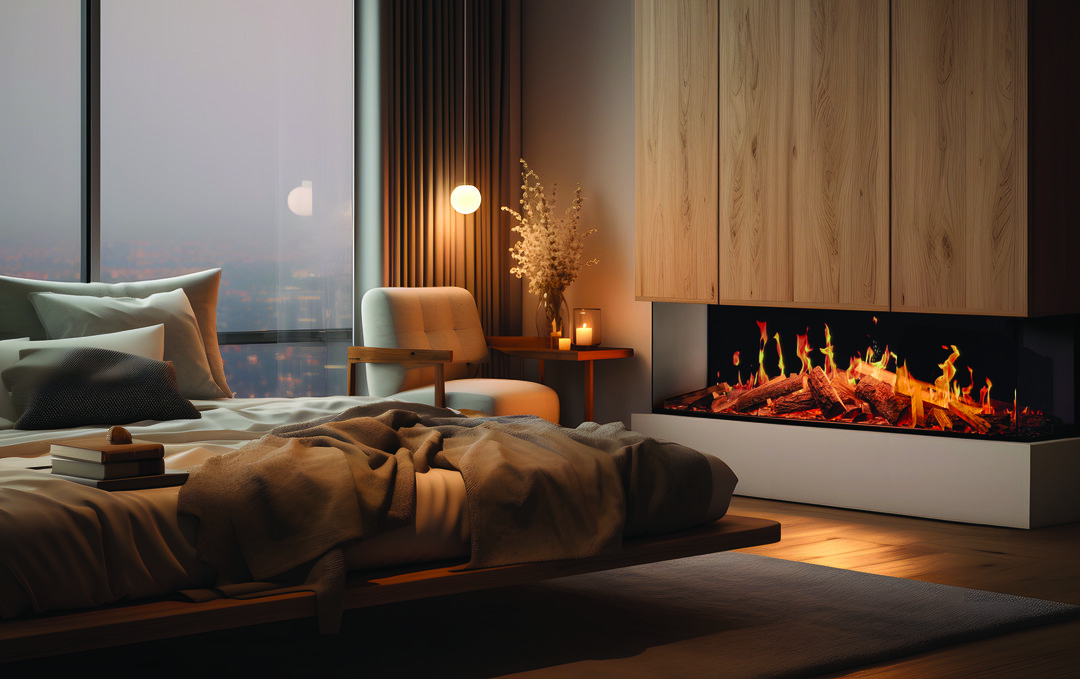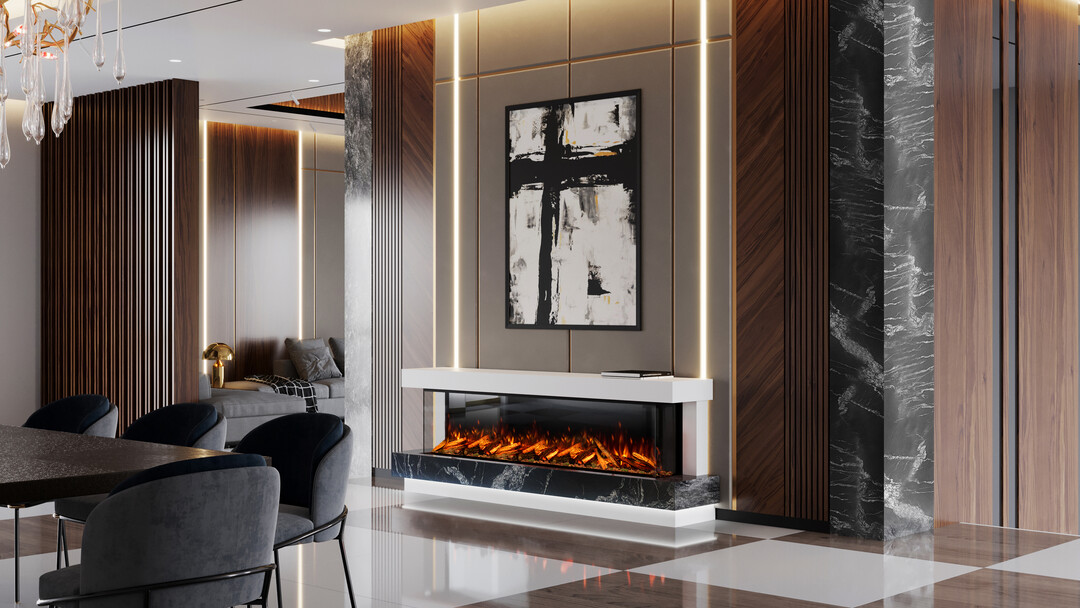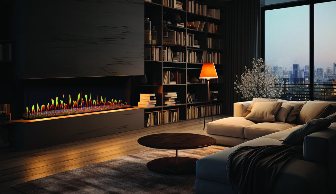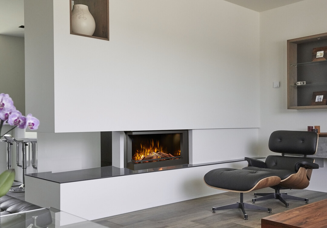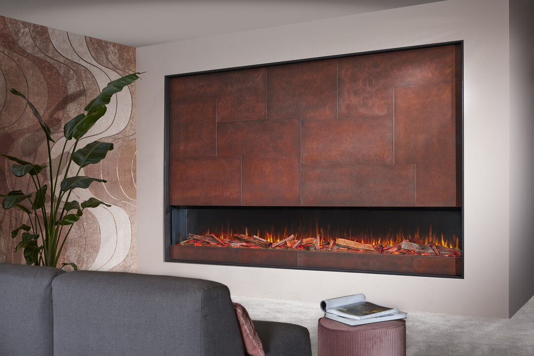 De haard biedt een vlamscherm van bioscoopformaat en heeft zeventien visuele effecten in HD kwaliteit. Het brandstofbed is gemaakt van echt hout waardoor een authentiek open vuur nog beter wordt gesimuleerd. Decoratieve stenen zorgen ervoor dat de waarneming van de gasvlam en tropische aquariumeffecten worden verbeterd. De haard kan ook via afstandsbediening en app* worden bediend.