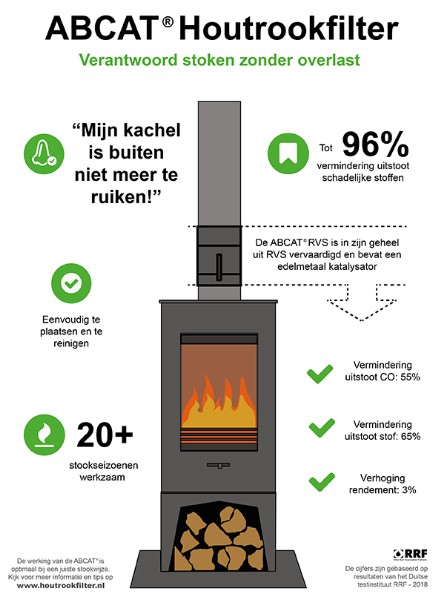 De ABCAT is een filter die je achter je stookinstallatie plaats, vaak in de kachelpijp. Het filter vermindert geurbelasting van de houtrook. In het stalen filter zit namelijk een katalysator van edelmetaal, waar de rookgassen doorheen trekken en deels in achterblijven.