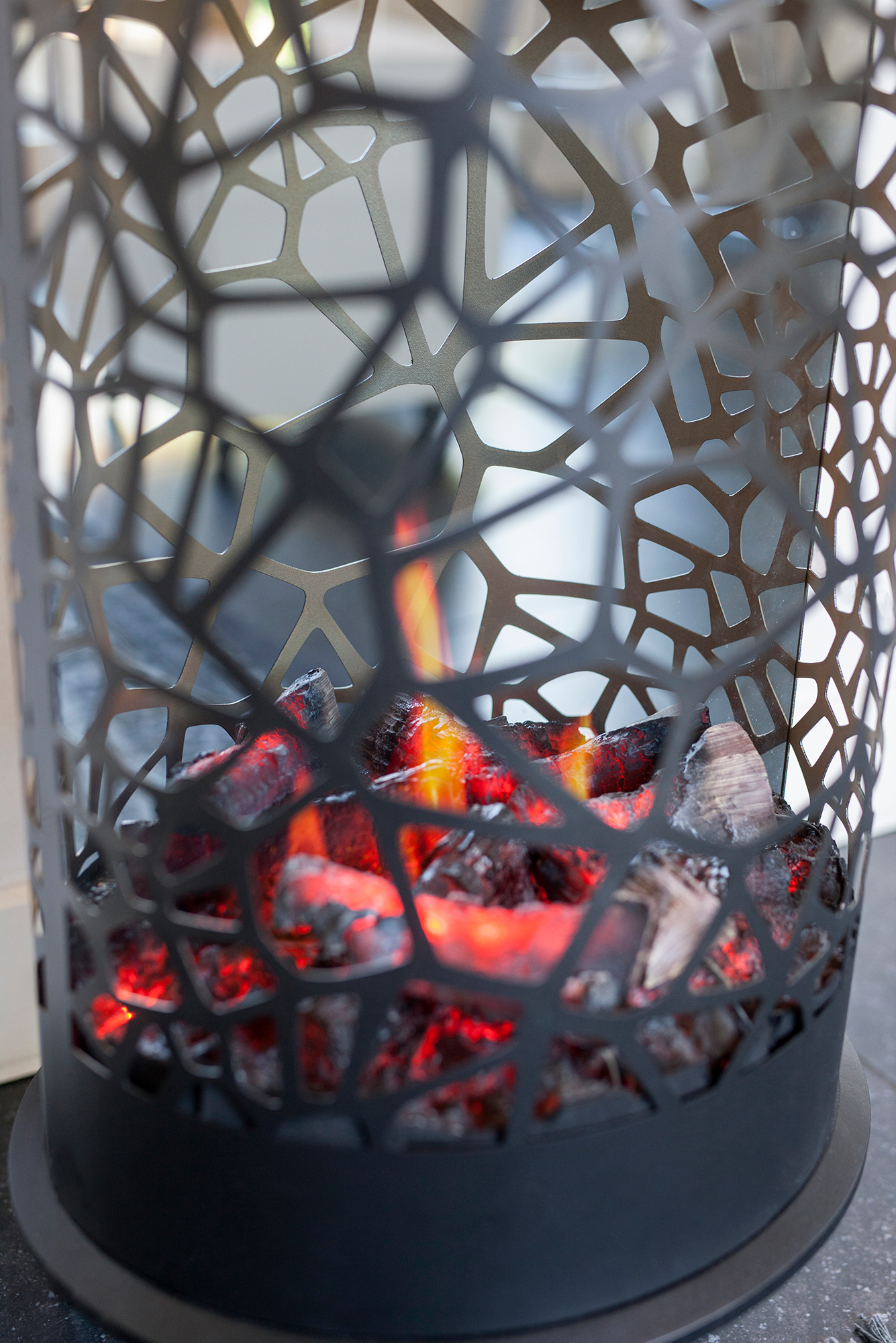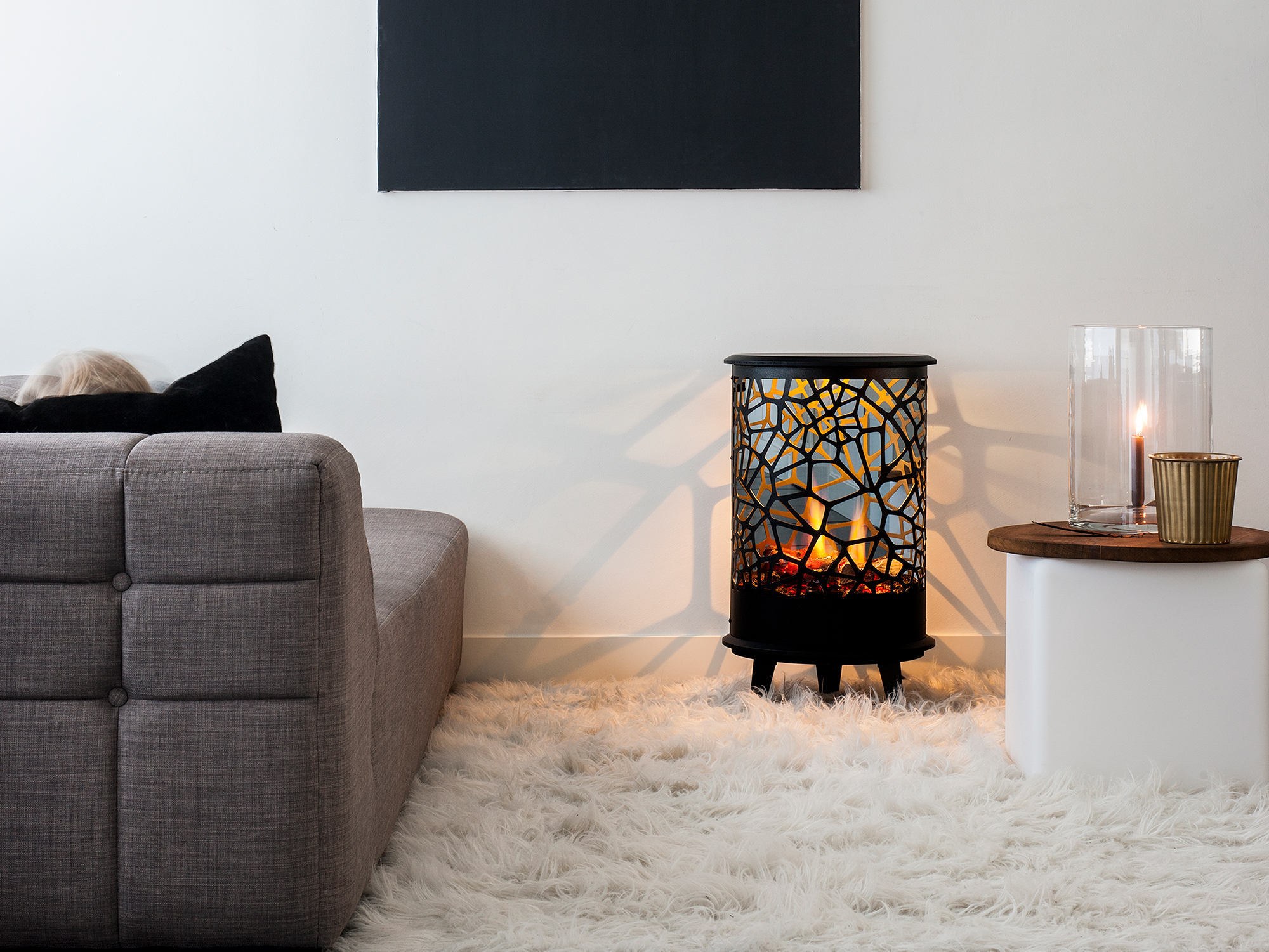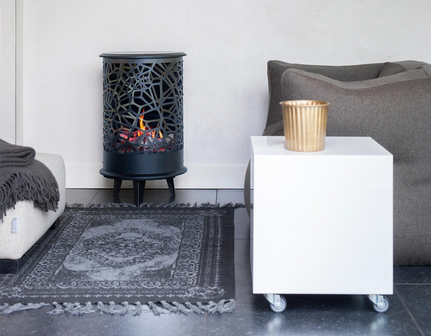 De nieuwe interieurtrend: een ronde elektrische open haard met lasercut design.