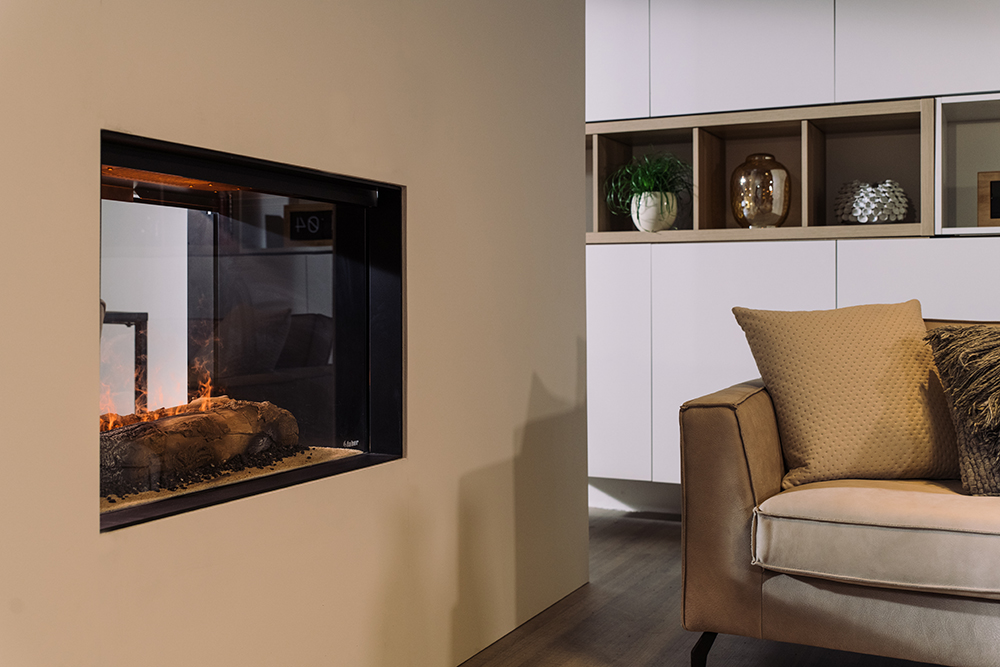 • De haard kan zo worden ingebouwd dat het glas direct aansluit op de ombouw.
