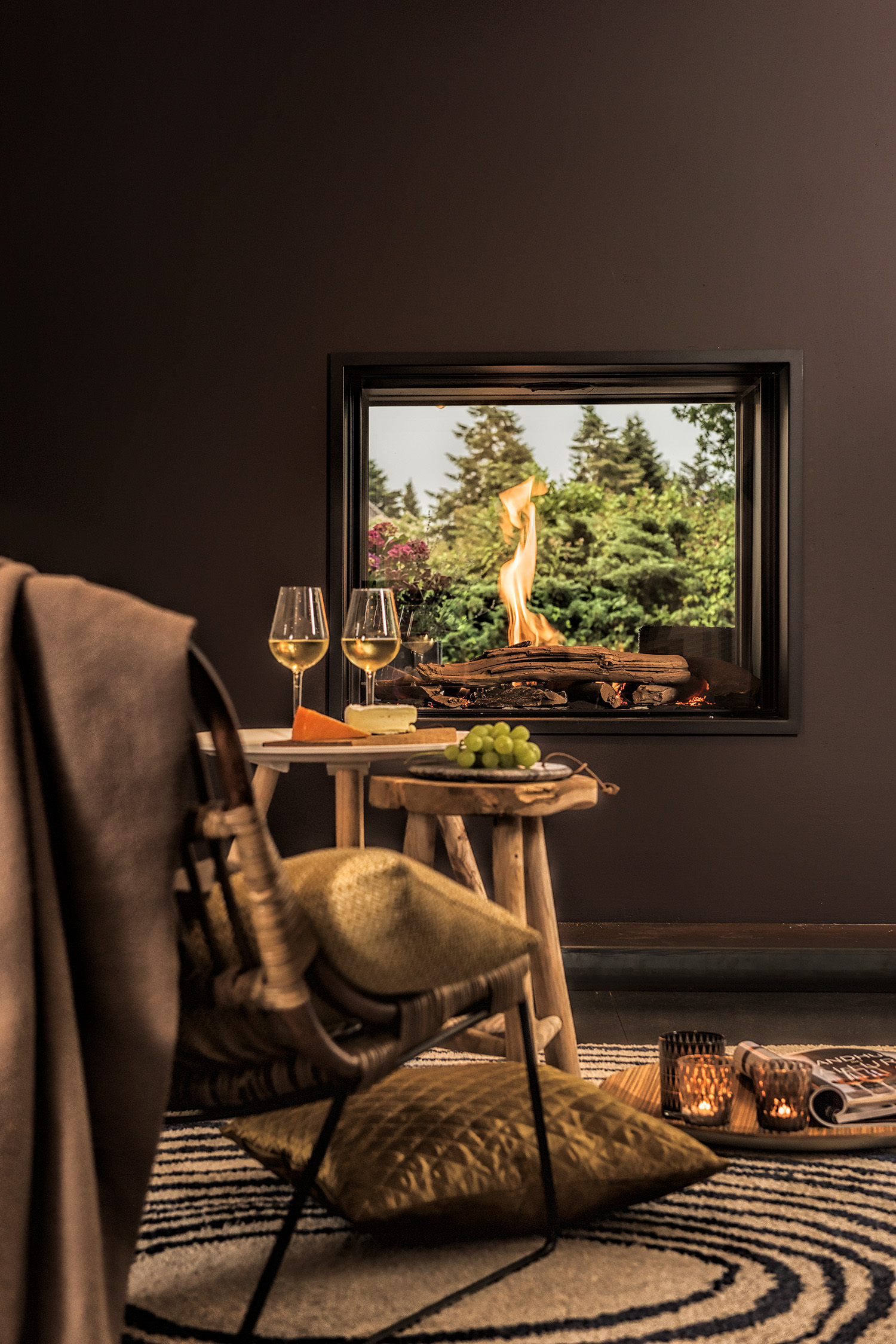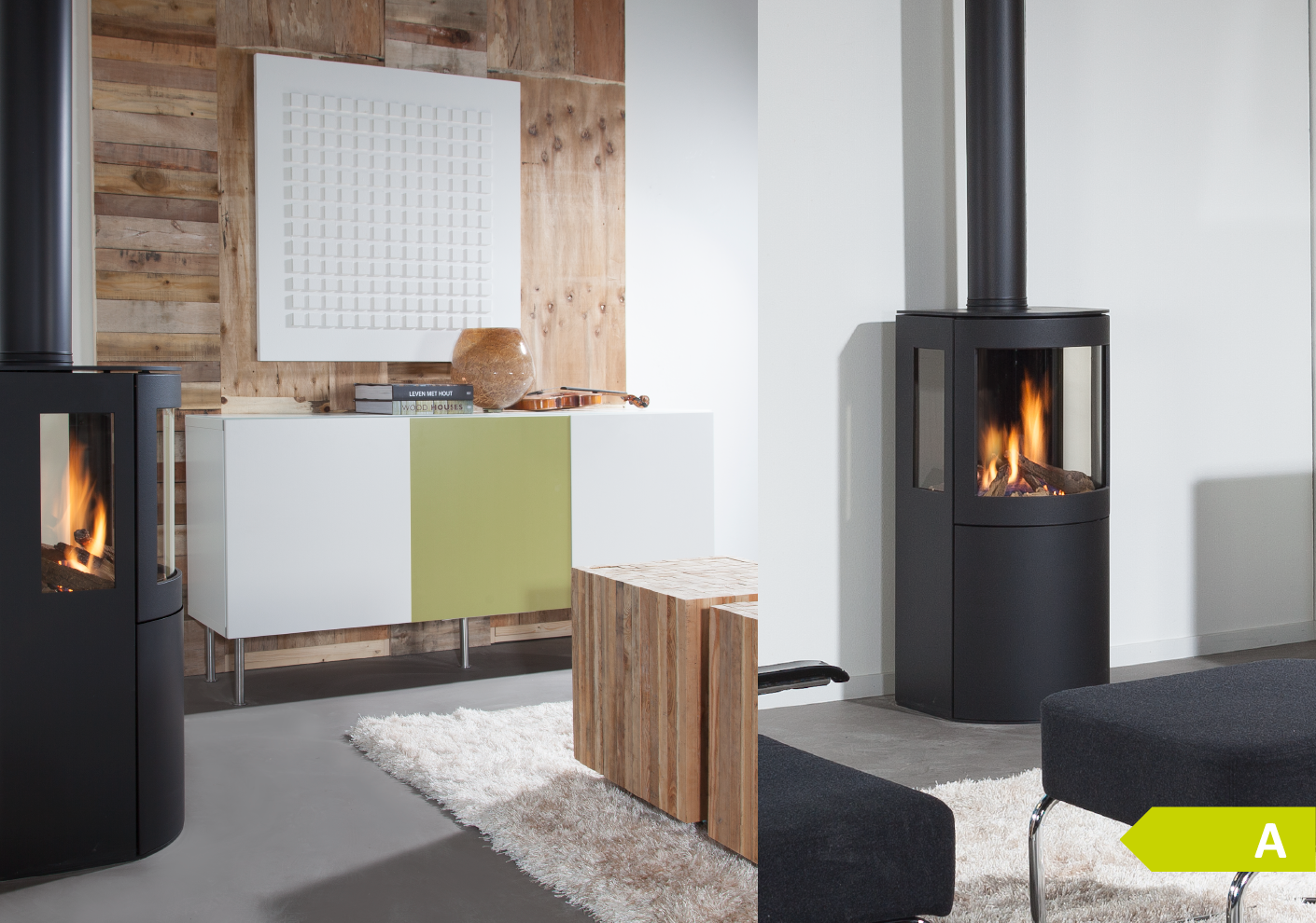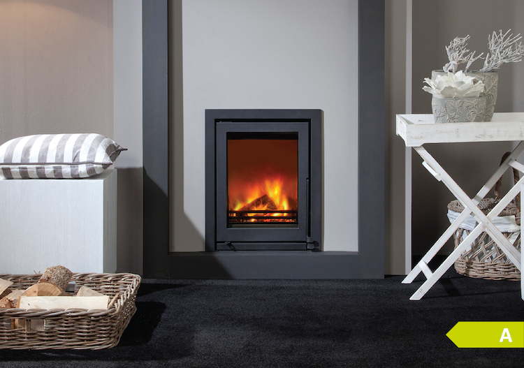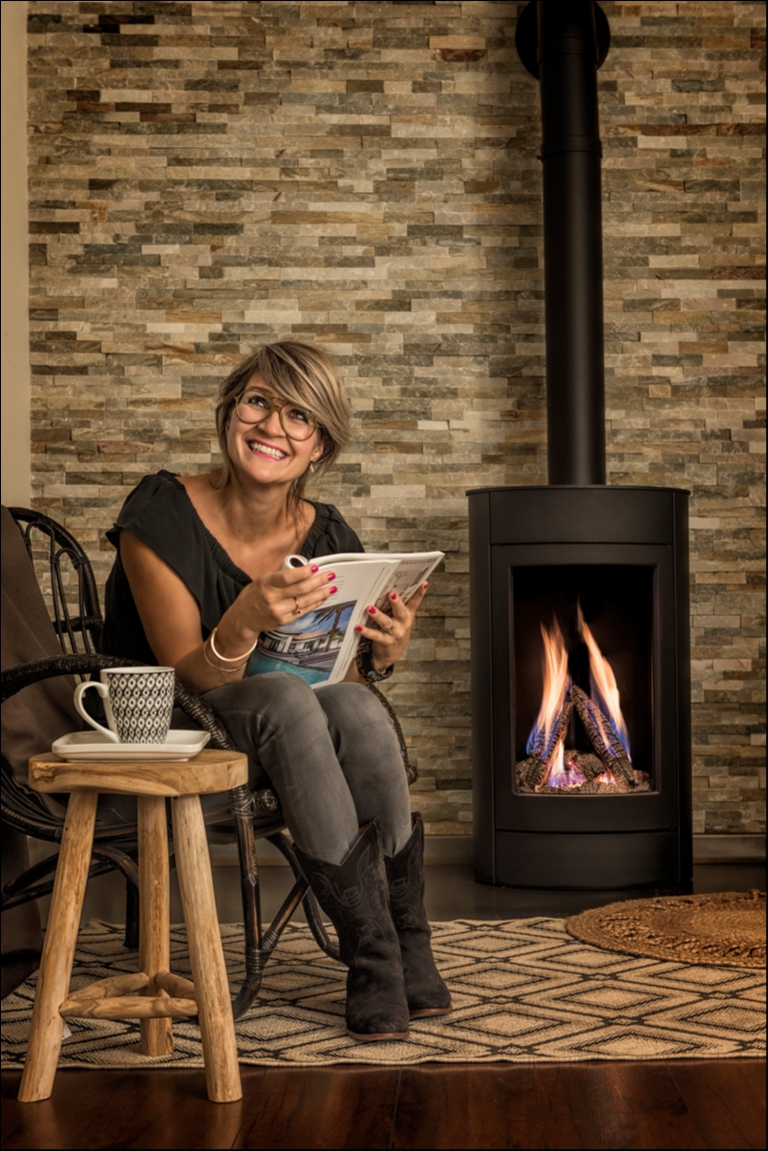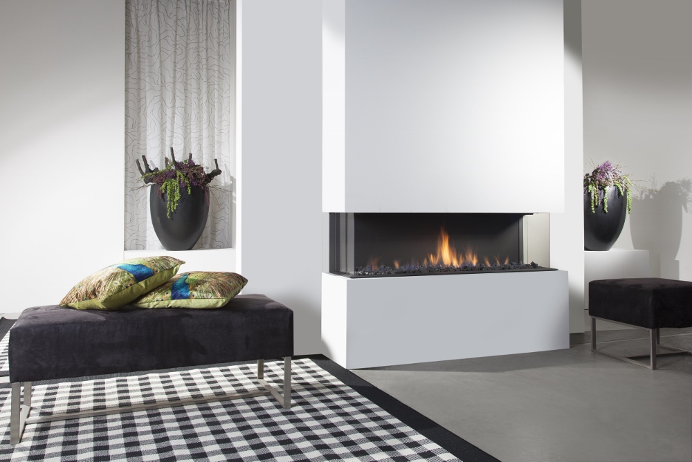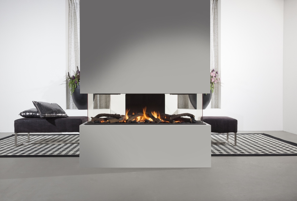 Een strakke inbouwhaard met groot vermogen. U kunt kiezen uit meerdere decoraties, zoals witte kiezels, keramisch hout of witte splitstenen.