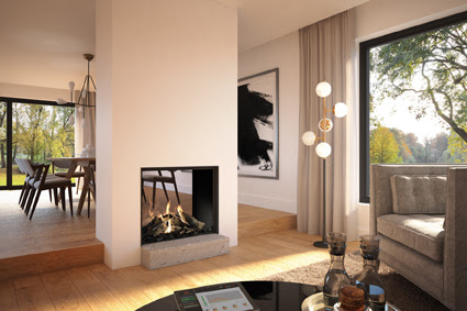 Een perfect zicht op het ultieme vuur met de Dru Maestro 75 Tunnel Eco Wave. Ideaal als roomdivider.