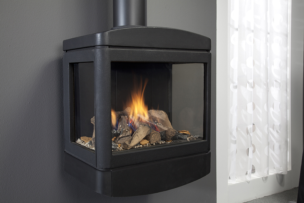 De Skive is een echte blikvanger in je woning. Deze moderne, vrijstaande driezijdige hanghaard in zwart gietijzer is strak, stoer en solide. Geniet van de heerlijke warmte van een Faber gashaard.