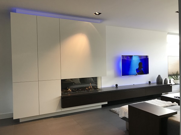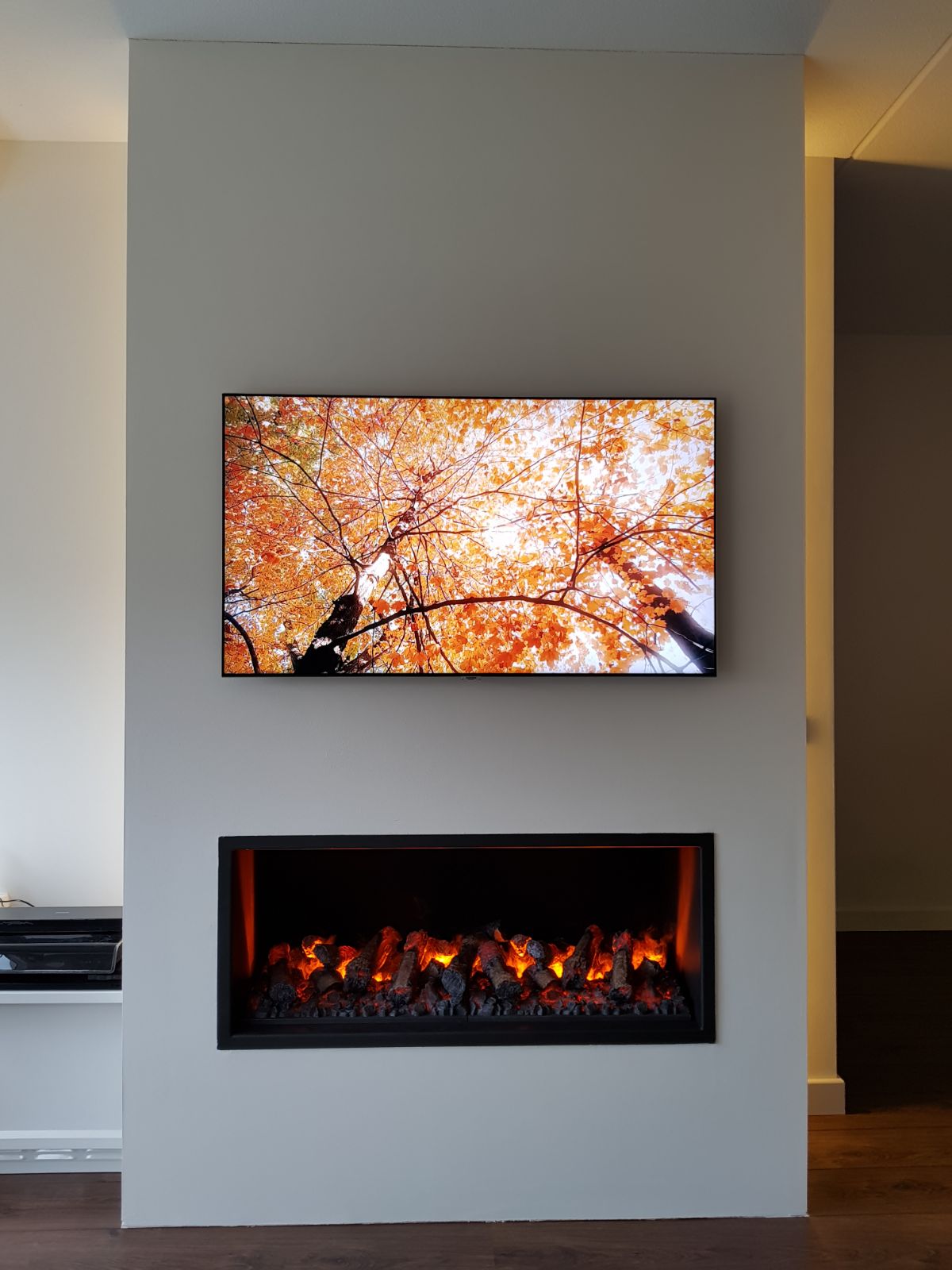 Complete wand van brandvrijeplaat en stak afgewerkt met stuucwerk. De ombouw maakt de haard bijzonder