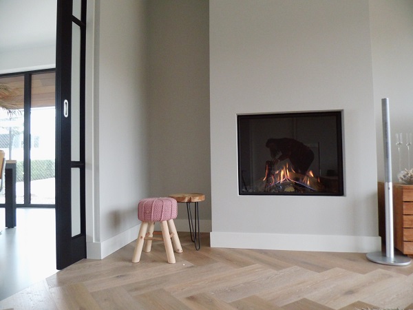 Bij deze gesloten gashaard ligt een eiken houten multivloer in visgraat daarlangs een gietvloer