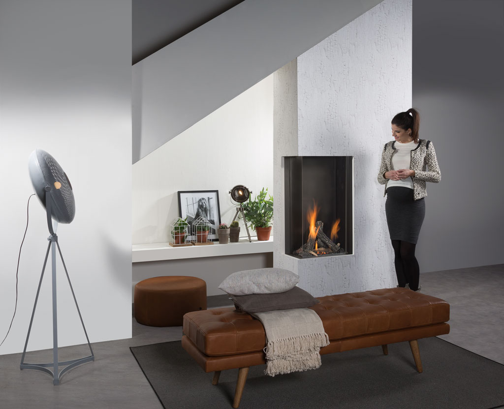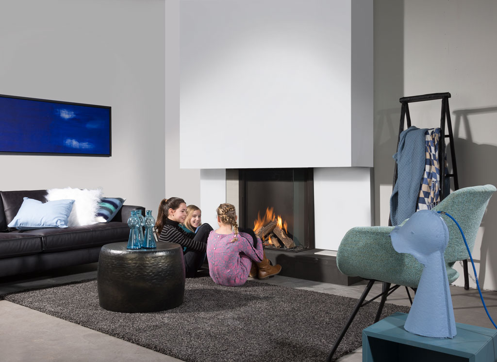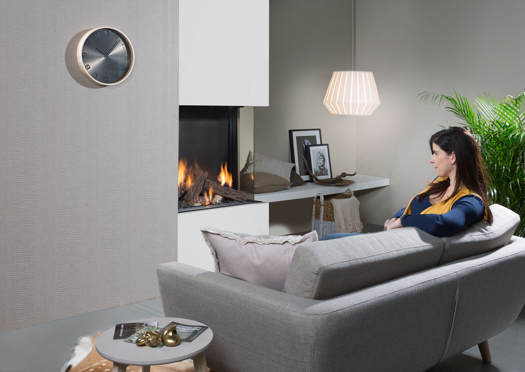 Overal in de ruimte mooi zicht op het vlammenspel bij deze driezijdige inbouwhaard.