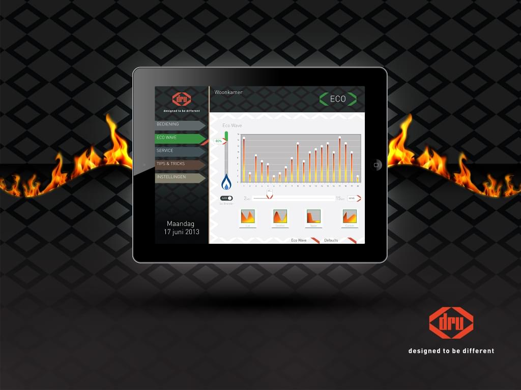 Alle haarden van DRU worden standaard geleverd met afstandsbediening. De nieuwe generatie slimme gashaarden van DRU kunnen nu ook met een handige App worden bediend. Via een Wi-Fi verbinding is het mogelijk om de haard te bedienen en met de Eco Wave stand een eigen favoriete vlammenpatroon te kiezen. Met de unieke combinatie van Eco Wave en Control App speelt DRU in op de huidige trend naar duurzaamheid, individualiteit en gemak.