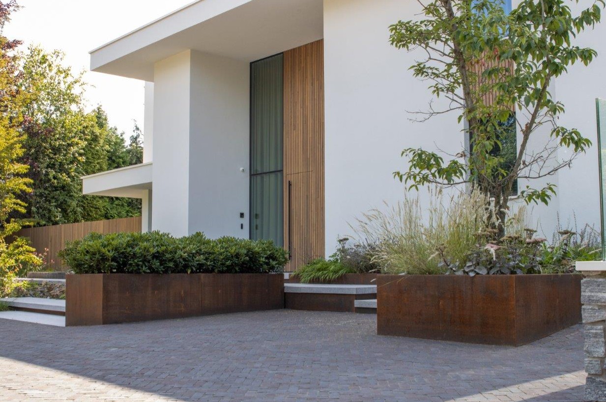 De by dens 100 houtopslag wordt geleverd in Cortenstaal. De roestlaag vormt zich na verloop van tijd.