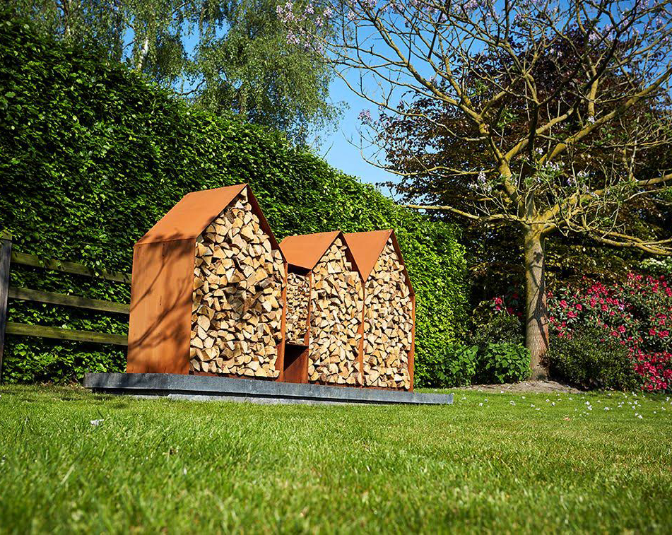 RB73 introduceert een bijzondere houtopslag ‘Brugge’ gemaakt van 3mm CorTen staal. Maar al te vaak wordt brandhout opgestapeld in de achtertuin, liefst uit het zicht achter een haagje of onder een geïmproviseerd afdakje. Dit terwijl gestapeld hout net een erg mooi beeld kan geven in de tuin. Uit dit basisidee ontwikkelde de Belgische ontwerper Jan Kuppers houtopslag ‘Brugge’, een opbergruimte uit CorTen staal waar de natuurlijke schoonheid van gestapeld hout gecombineerd wordt met het geroeste staal in een natuurlijk groene setting. ‘Brugge’ kreeg de vorm van de typische gekende Belgische gevelbouw. Het ontwerp is opgebouwd uit verschillende modules waardoor het uit te breiden is naar ieders individuele behoefte.