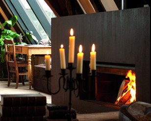 De Stûv microMega is een haard met schuifdeur: de ruit schuift naar boven om hout bij te laden. Hij kan als open haard werken.