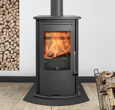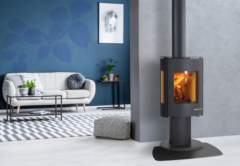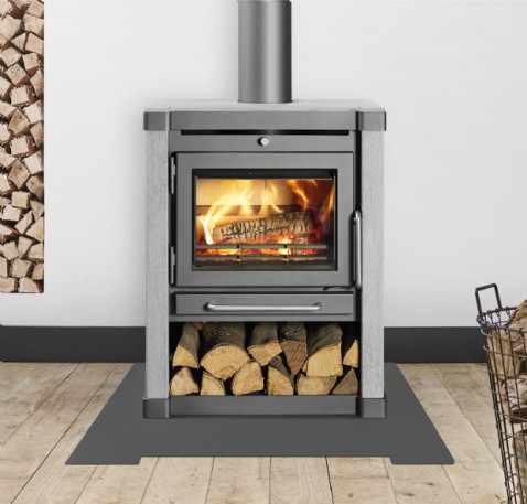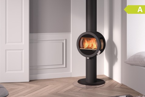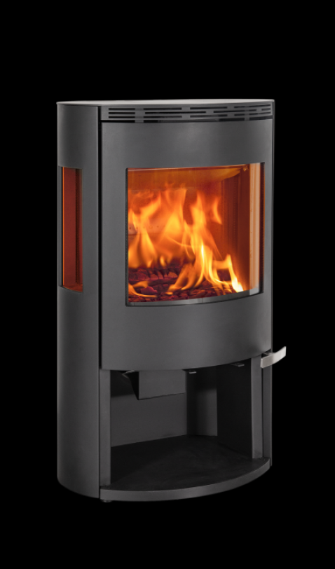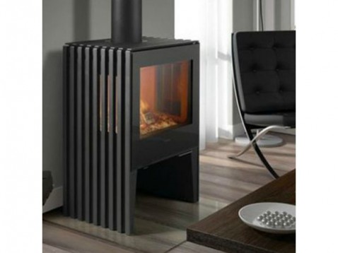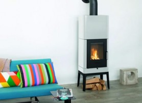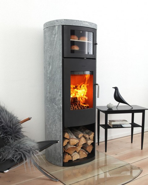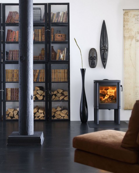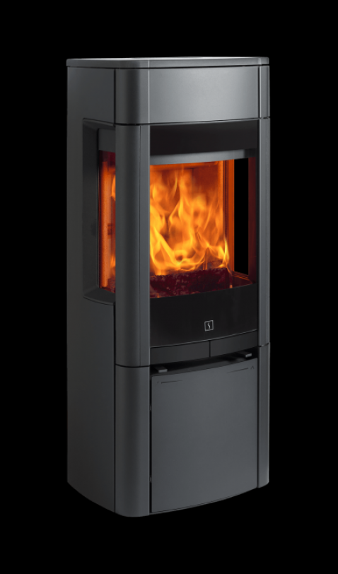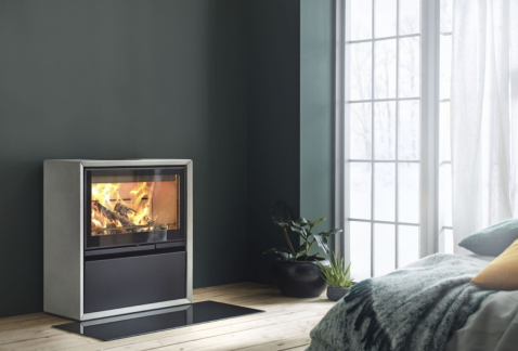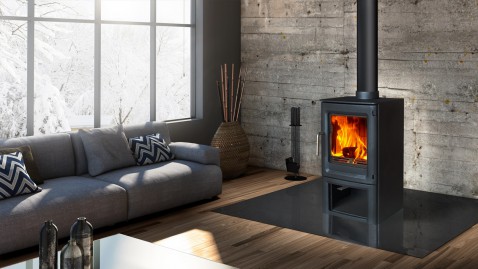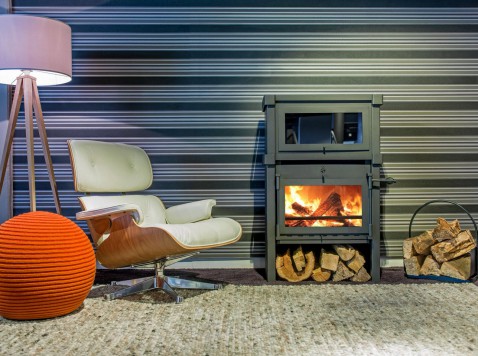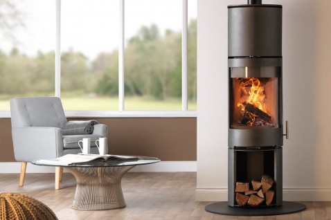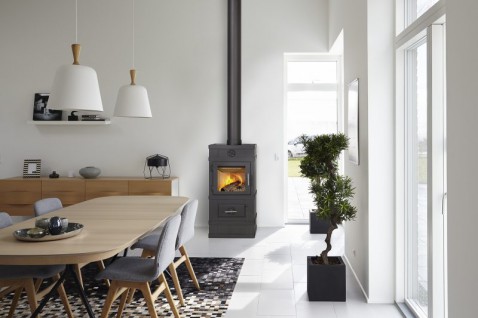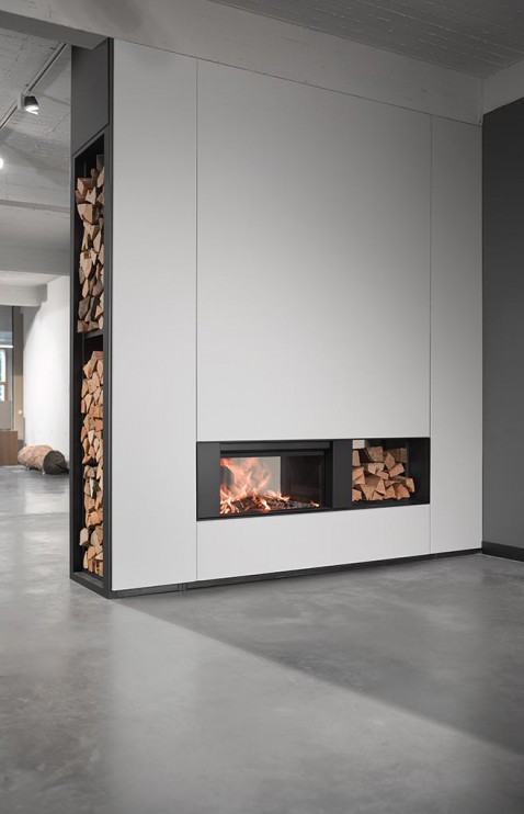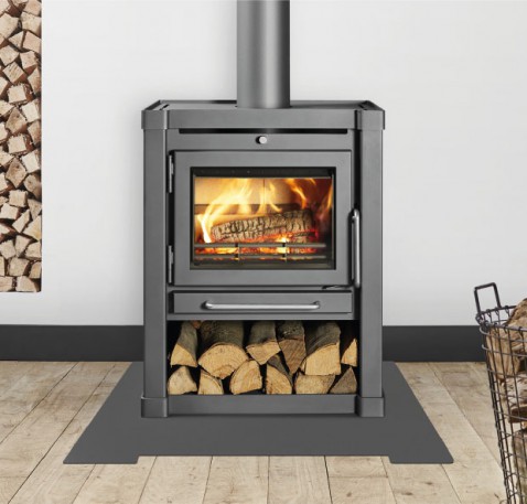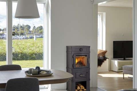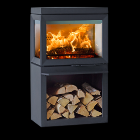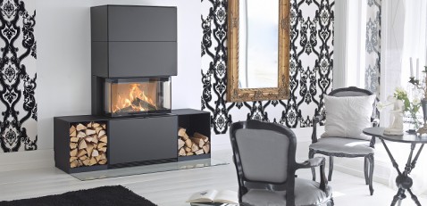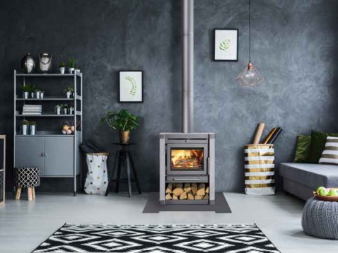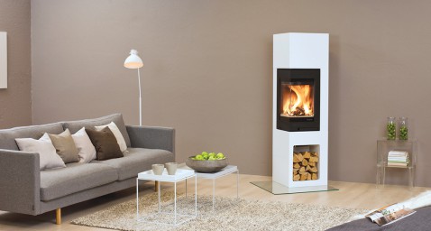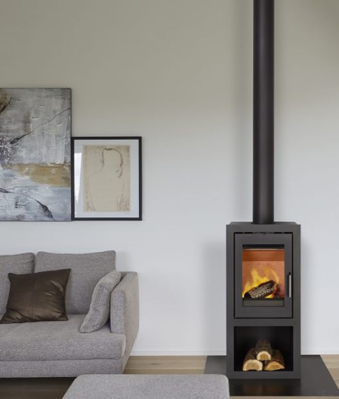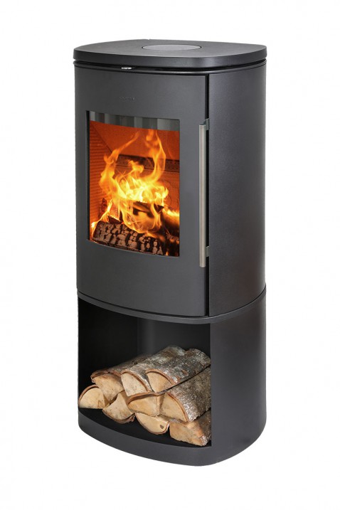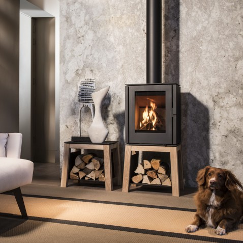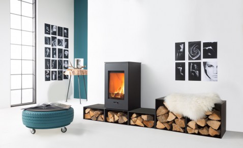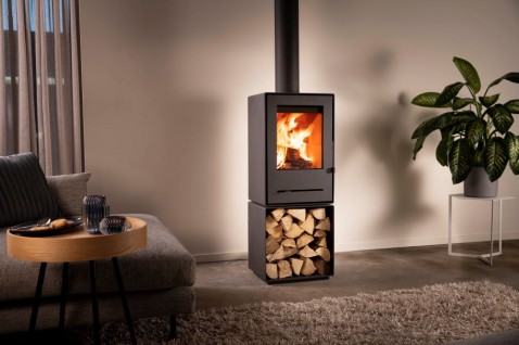 Een strakke, gestroomlijnde houtkachel die eventueel uit te breiden is met stijlvolle onderdelen voor houtopslag.