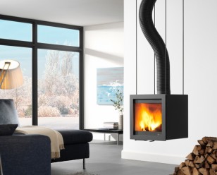 Deze vrijstaande houtkachel, Babe Swing van Dik Geurts, is uitermate geschikt voor plaatsing in het midden van een ruimte.