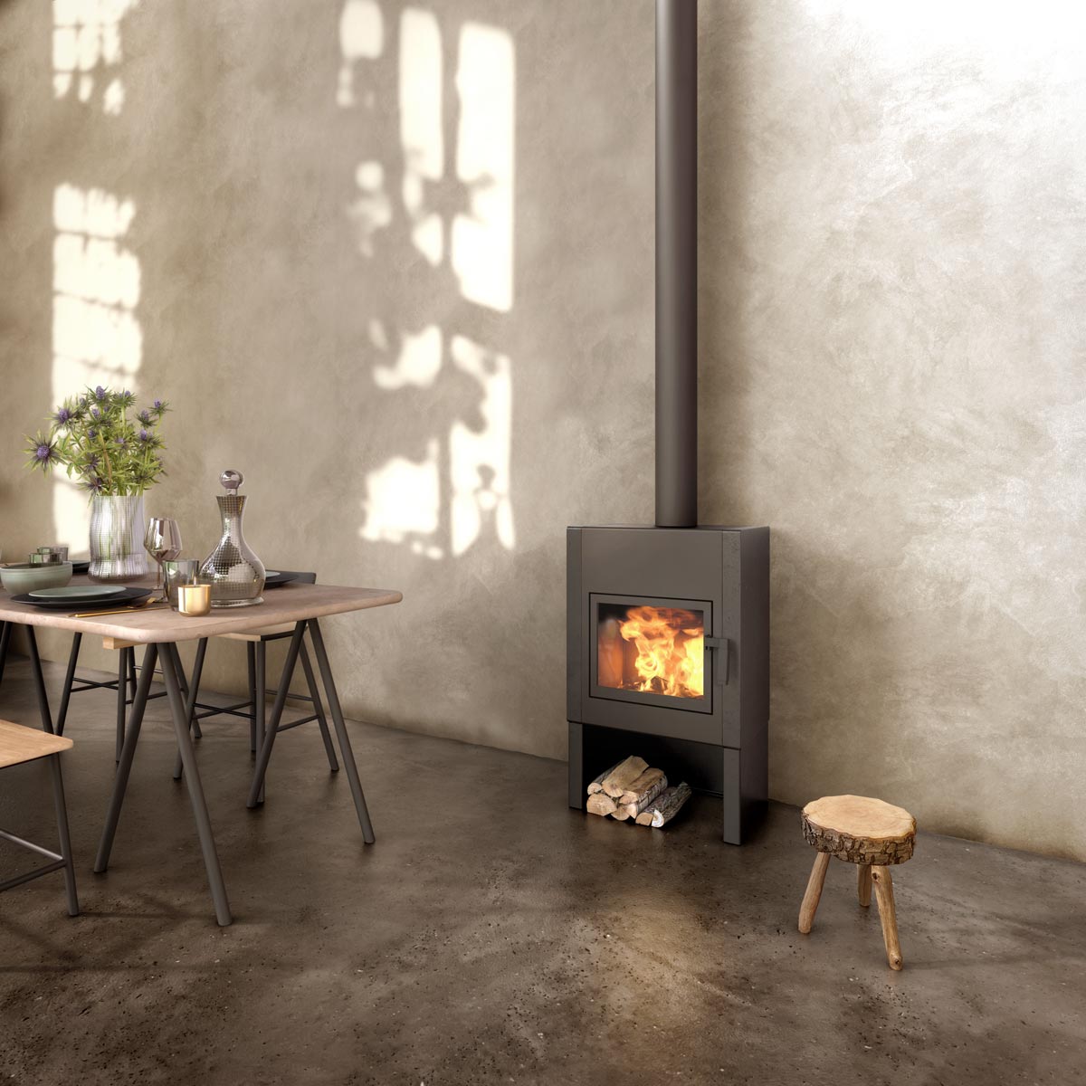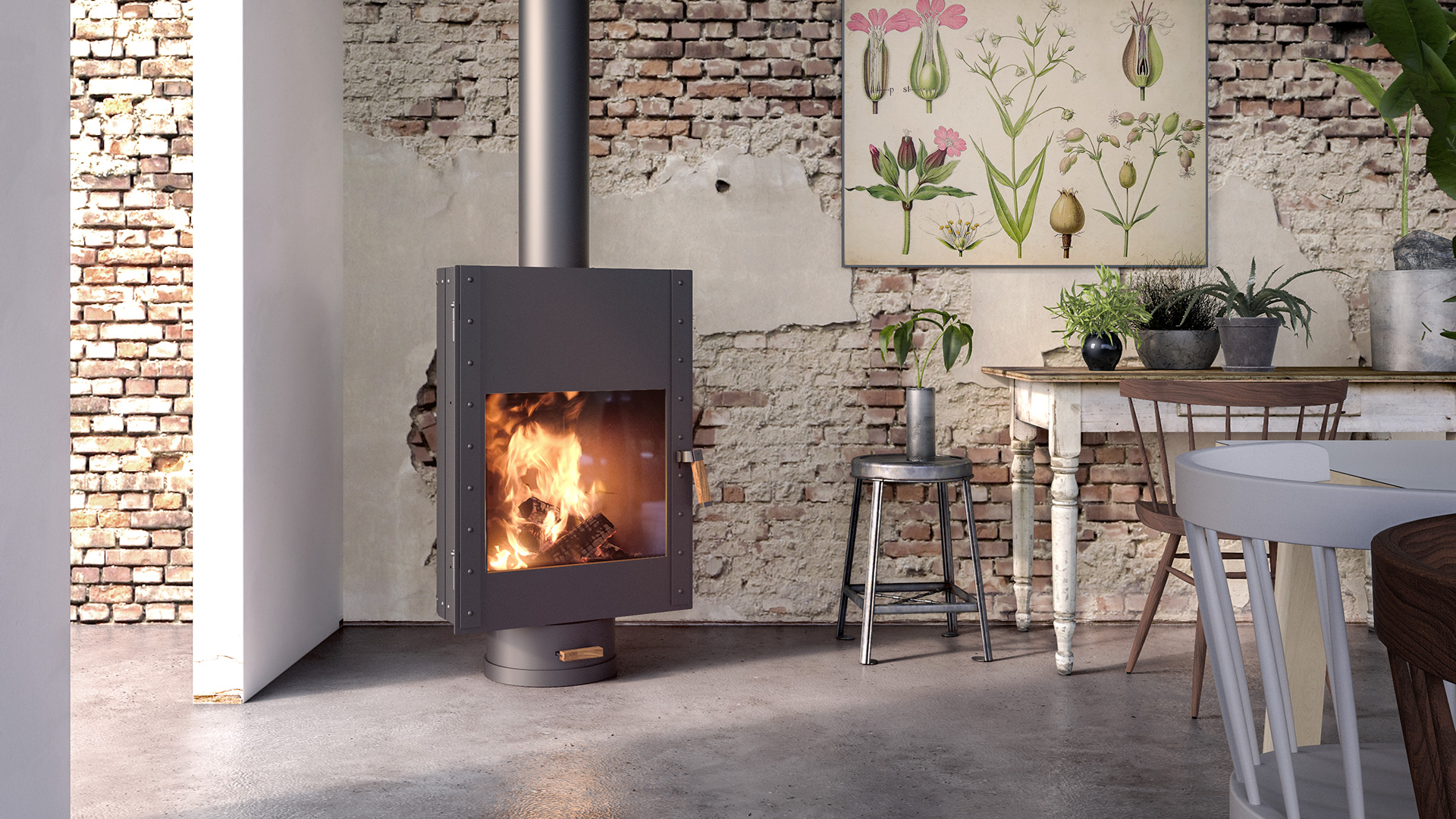Vrijstaande draaibare houtkachel met krachtig vuur en stijlvol design voor sfeervolle warmte in huis