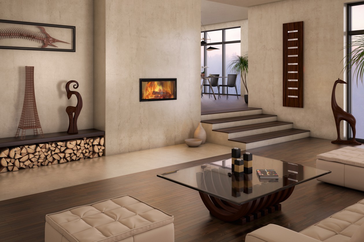 Strakke Spartherm houthaard met driezijdig frame en uniek liftdeur systeem. De geringe inbouwdiepte en het aantrekkelijke vermogen karakteriseren de haard.