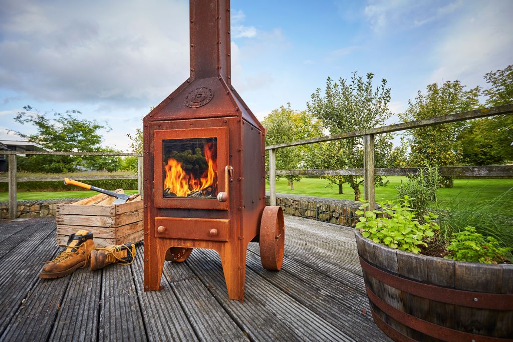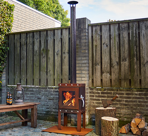 Stijlvolle terras houtkachel van Cor-Ten staal, model BIJUGA