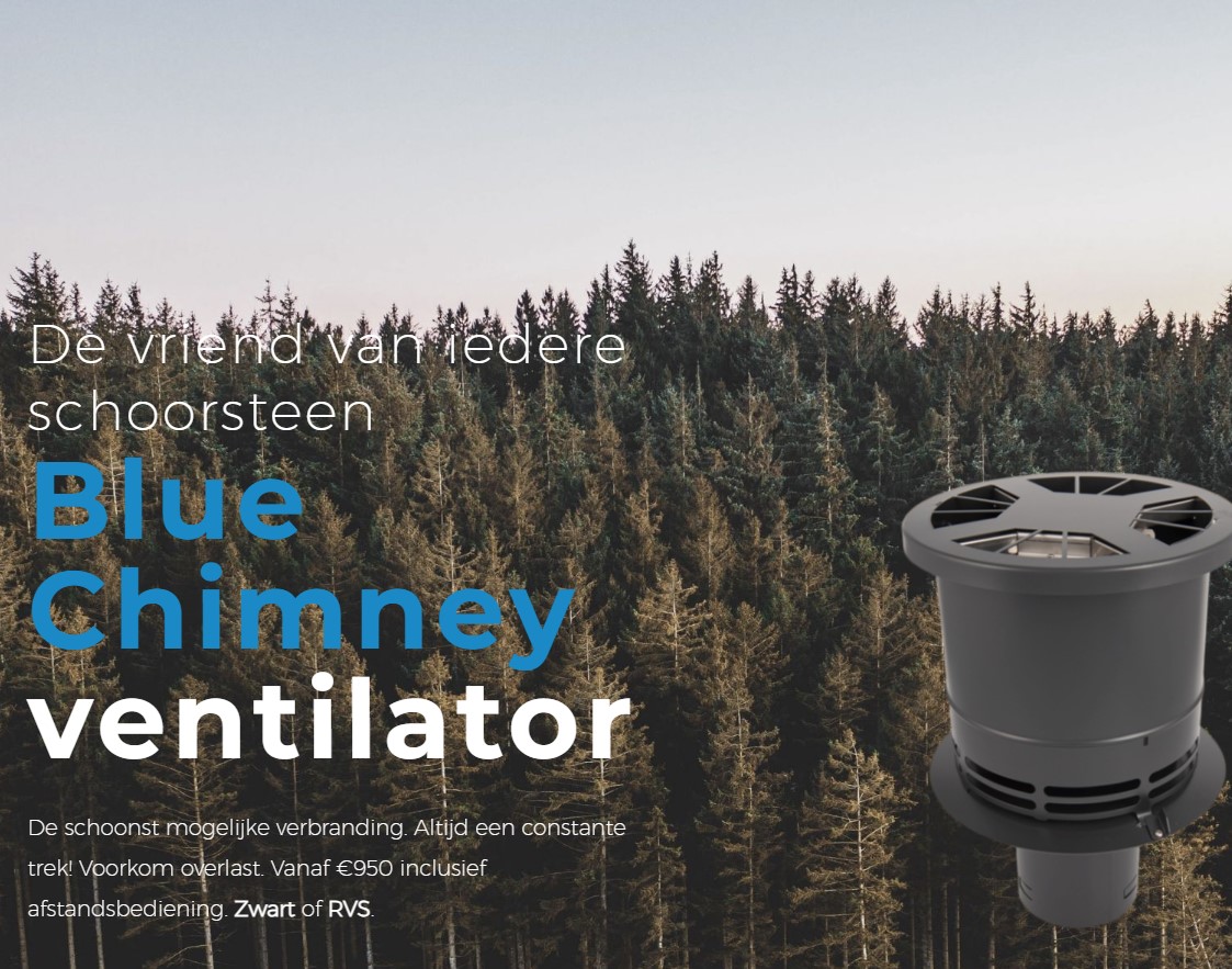 De BlueChimney rookgasventilator wordt bovenop de schoorsteen gemonteerd. De ventilator trekt als het ware de rookgassen uit de kachel en vermengt het met schone lucht. Dit mengsel wordt hoog boven de schoorsteen uitgeblazen. De BlueChimney is uitermate geschikt in combinatie met de top-down aansteekmethode, ook wel de Zwitserse methode genoemd. Deze methode zorgt ervoor dat er zo min mogelijk rookoverlast plaats vindt tijdens het aansteken van je houtkachel.