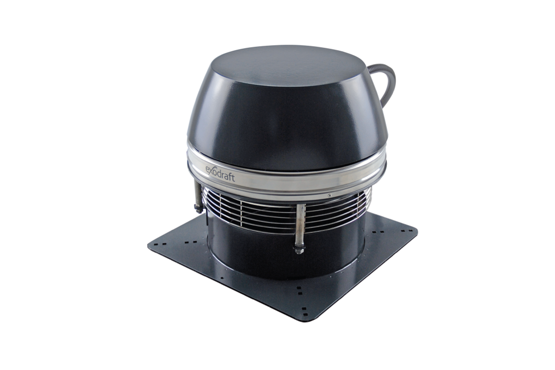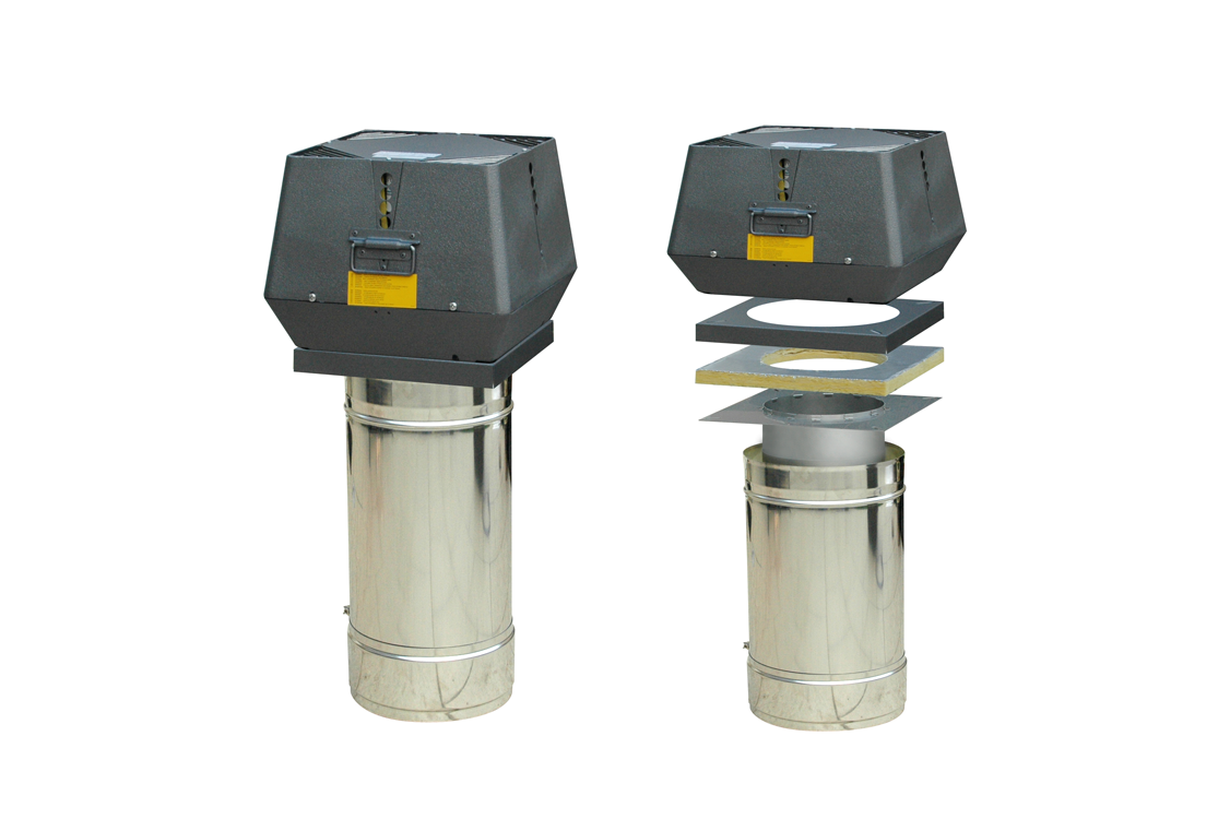 De rookgasventilator RSV wordt normaal gesproken boven op de schoorsteen geïnstalleerd en heeft een verticale uitblaas. De ventilator kan ook op de muur gemonteerd worden.