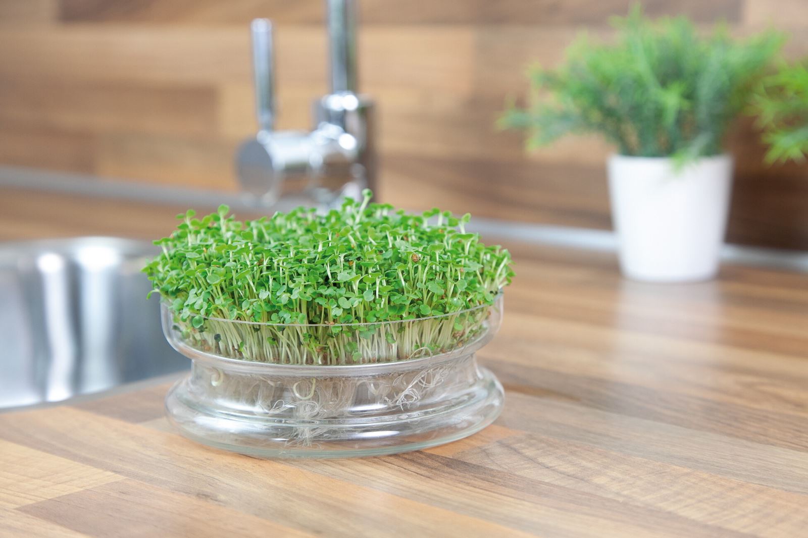Het grote voordeel van kiemgroenten is ook dat ze gemakkelijk binnen te kweken zijn en weinig ruimte in beslag nemen.