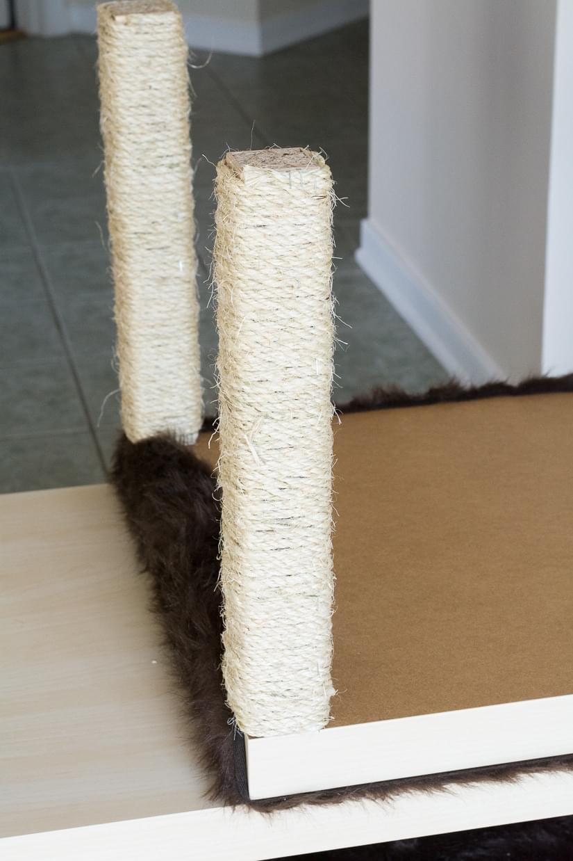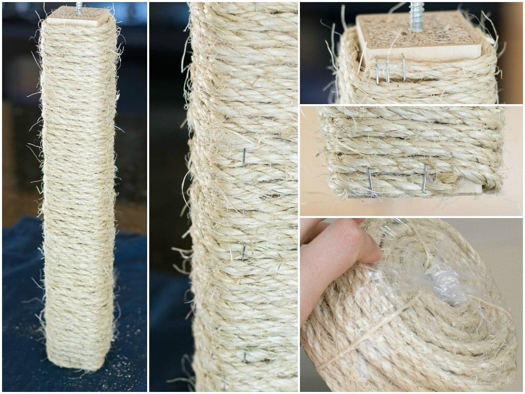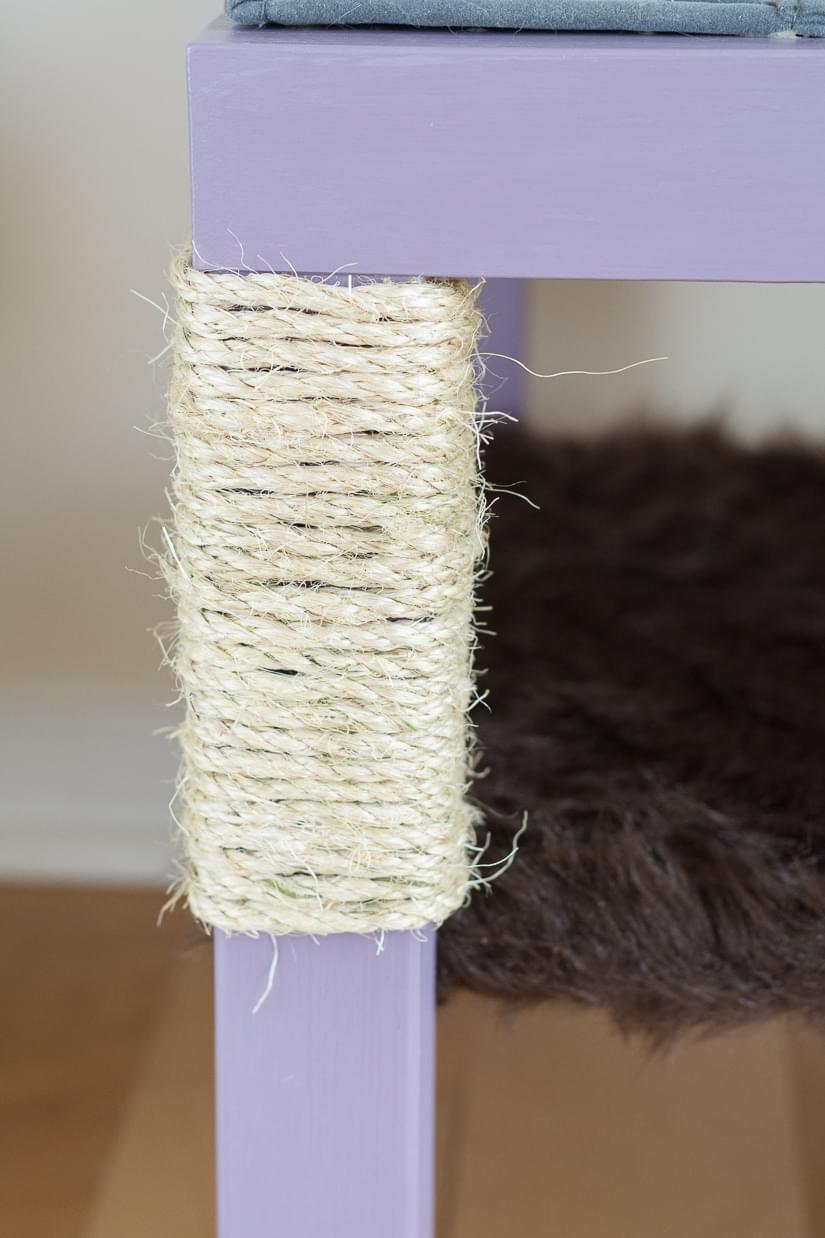 Met het sisal touw ga je nu de krabpalen maken. Brittany koos ervoor om tweeënhalve poot in te wikkelen met sisal, maar je kunt er natuurlijk zoveel doen als je zelf wil. Voor tweeënhalve poot heb je ongeveer 30 meter sisal touw van 1 cm dik nodig.