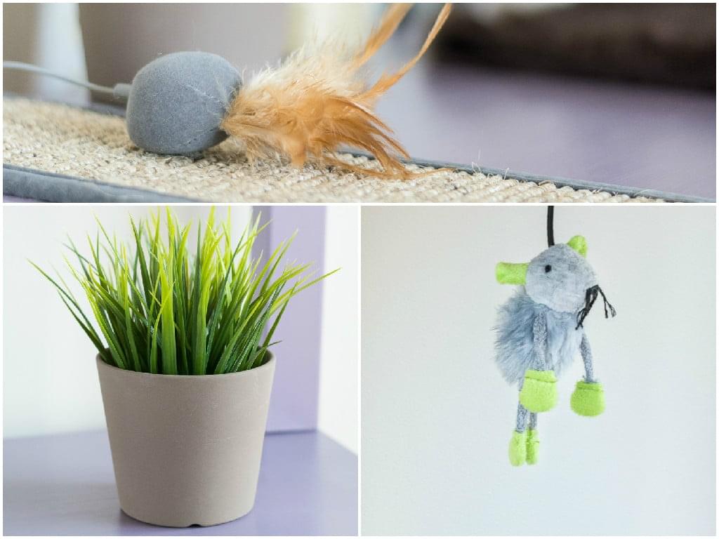 Draai een kleine schroefhaak met oog op een leuke plek en hang daar een leuk kattenspeeltje aan.