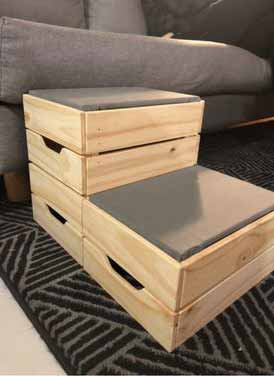Is je hond niet al te groot, dan kun je op een heel eenvoudige en leuke manier een opstapje maken zodat hij bijvoorbeeld makkelijker op de bank kan komen. Het enige wat je nodig hebt zijn IKEA KNAGGLIG kistjes en een GURLI kussen.
