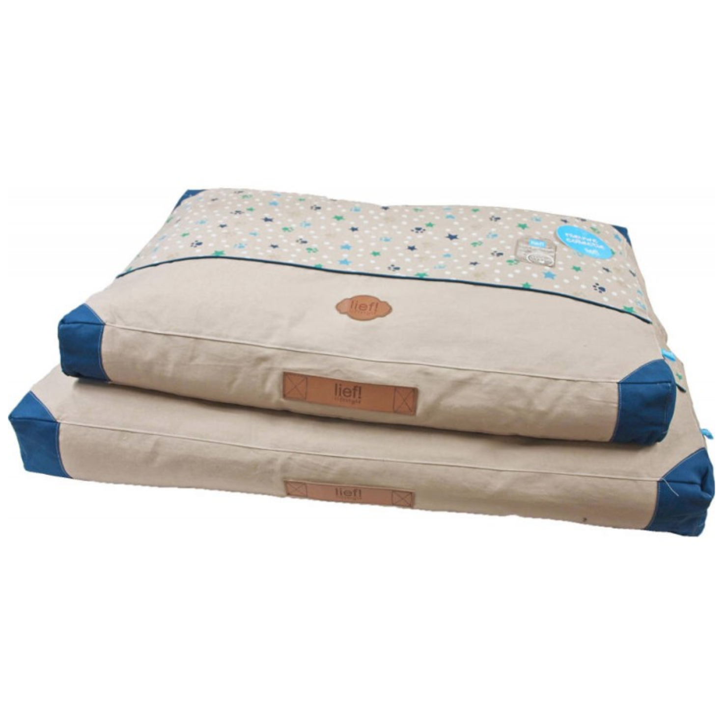Het patroon van stippen, sterren en pootjes, handvat, blauwe bies en verstevigde hoeken van het kussen maken dit kussen een sieraad voor uw woning. Uw trouwe viervoeter kan uren lang lekker lui zijn op het lounge kussen.
